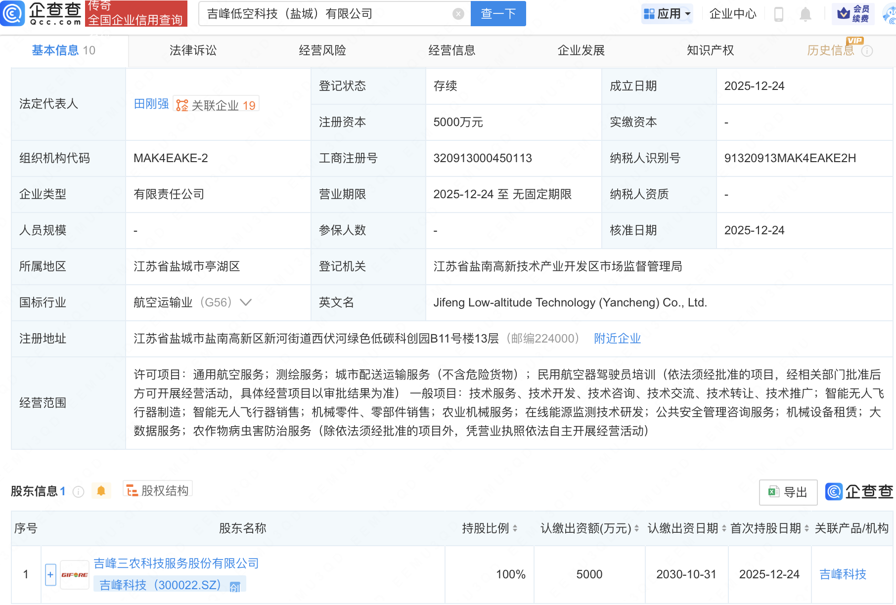 企查查APP显示,近日,吉峰低空科技(盐城)有限公司成立,注册资本5000万元,经营范围包含:通用航空服务;民用航空器驾驶员培训;智能无人飞行器制造;智能无人飞行器销售等。企查查股权穿透显示,该公司由吉峰科技(300022)全资持股。