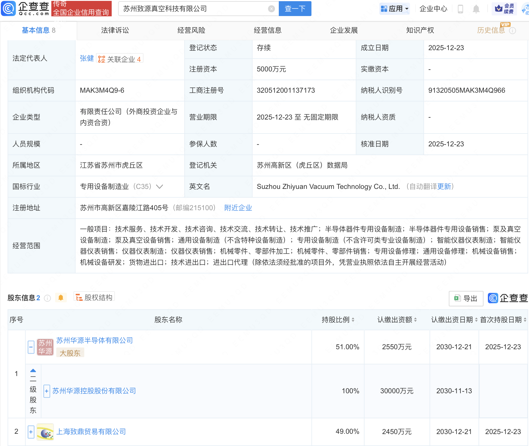 企查查APP显示,近日,苏州致源真空科技有限公司成立,注册资本5000万元,经营范围包含:半导体器件专用设备制造;半导体器件专用设备销售;泵及真空设备制造;泵及真空设备销售等。企查查股权穿透显示,该公司由华源控股(002787)全资子公司苏州华源半导体有限公司等共同持股。