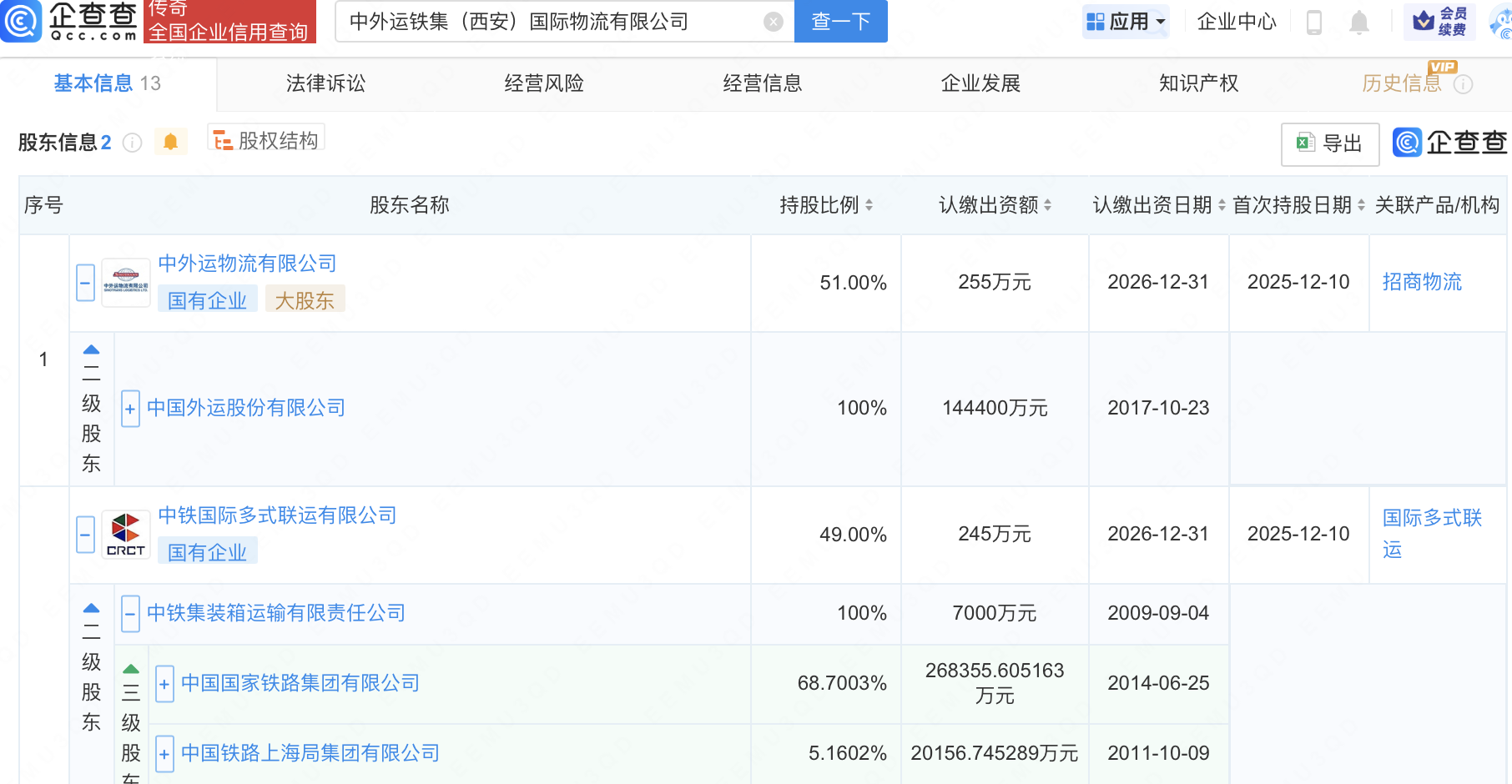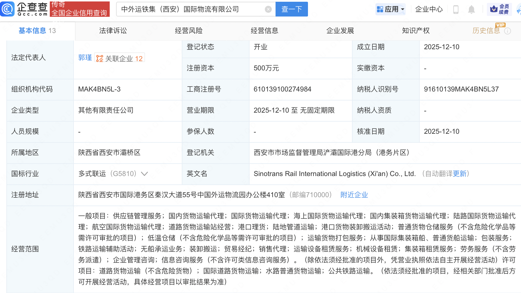 企查查APP显示,近日,中外运铁集(西安)国际物流有限公司成立,经营范围包含:供应链管理服务;国内货物运输代理;国际货物运输代理;海上国际货物运输代理等。企查查股权穿透显示,该公司由中国外运(601598)全资子公司中外运物流有限公司、中国国家铁路集团有限公司旗下中铁国际多式联运有限公司共同持股。