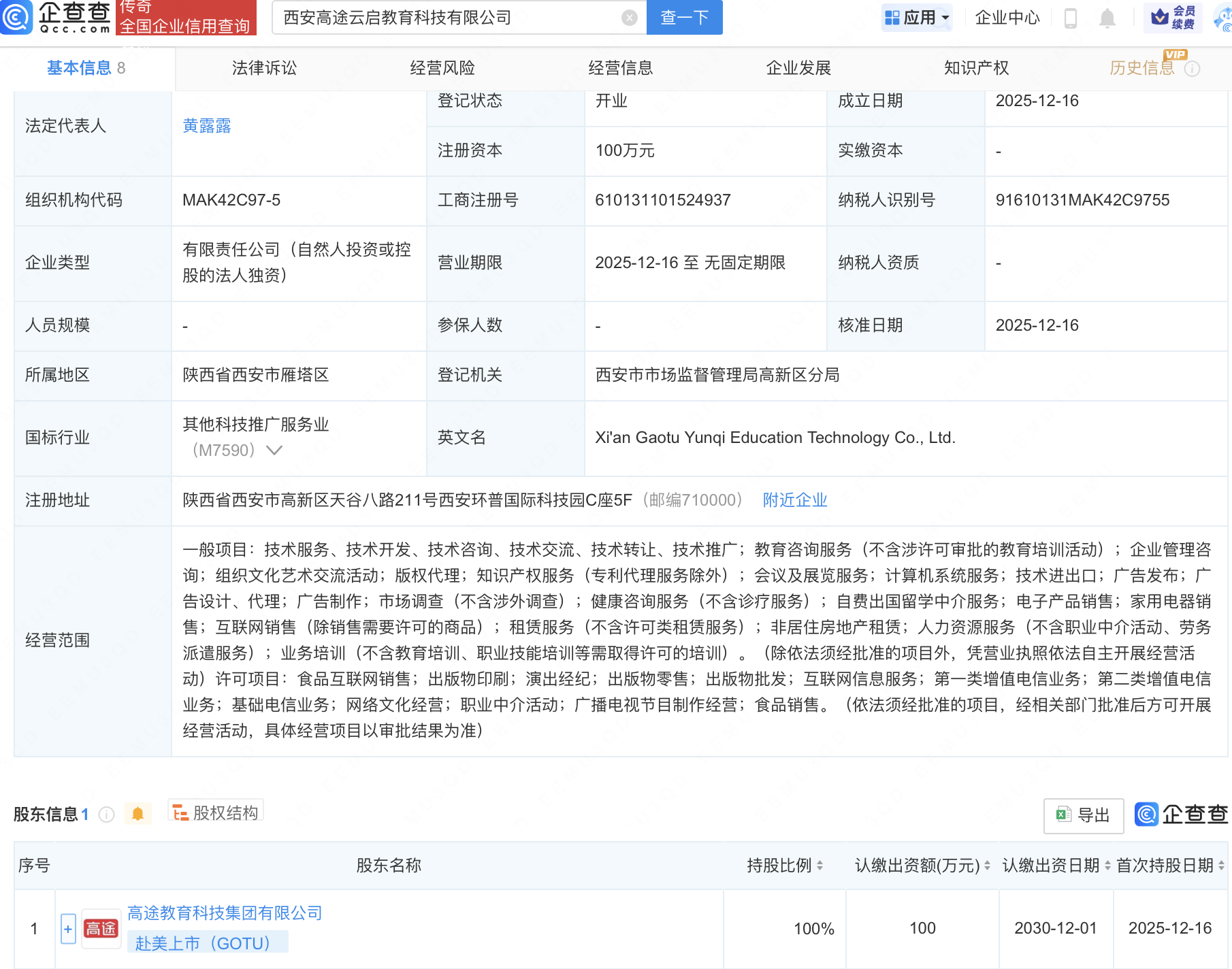 企查查APP显示,近日,西安高途云启教育科技有限公司成立,经营范围包含:食品互联网销售;出版物印刷;演出经纪;出版物零售;出版物批发等。企查查股权穿透显示,该公司由高途教育科技集团有限公司全资持股。