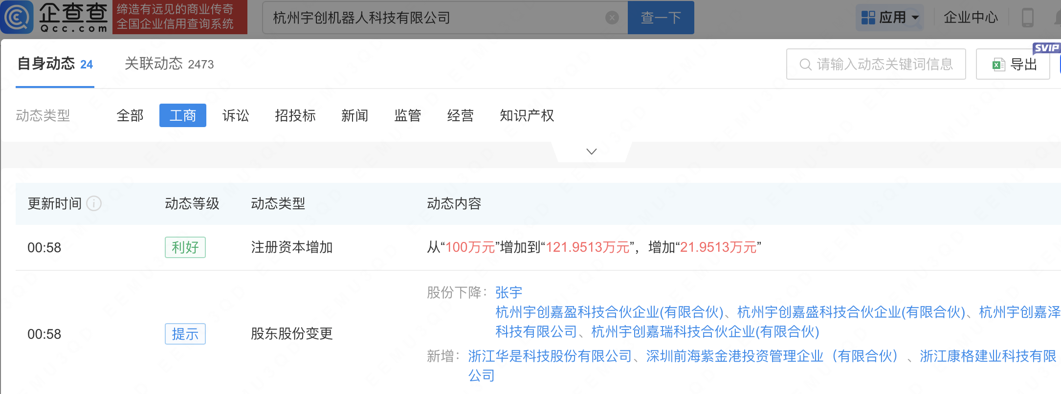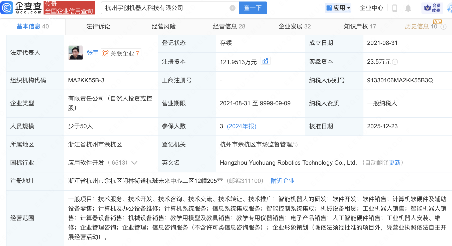 企查查APP显示,近日,杭州宇创机器人科技有限公司发生工商变更,新增华是科技(301218)等为股东,同时注册资本增至121.95万元。企查查信息显示,该公司成立于2021年,法定代表人为张宇,经营范围包含:智能机器人的研发;智能机器人销售;人工智能硬件销售等。