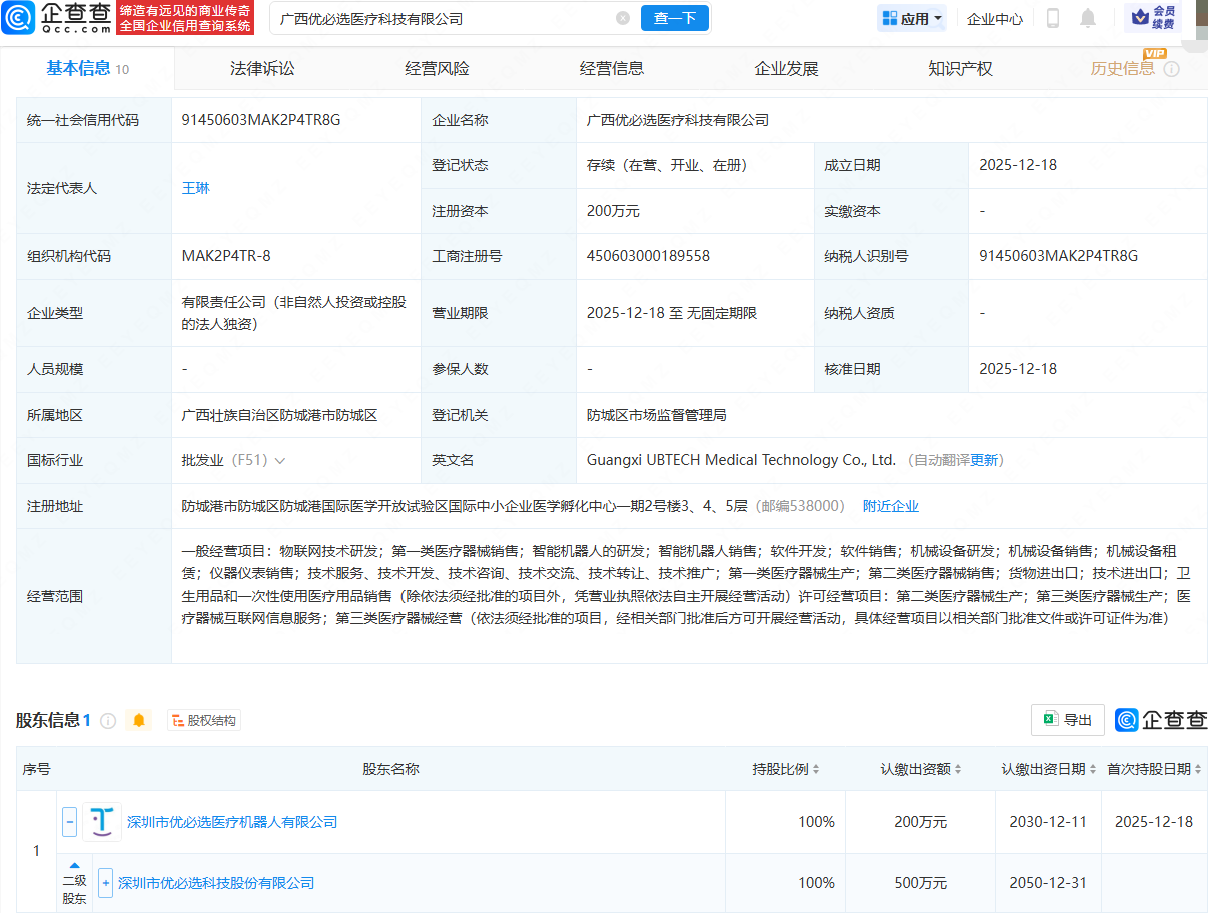 企查查APP显示,近日,广西优必选医疗科技有限公司成立,法定代表人为王琳,经营范围包含:物联网技术研发;第一类医疗器械销售;智能机器人的研发;智能机器人销售;软件开发;软件销售等。企查查股权穿透显示,该公司由优必选(09880.HK)间接全资持股。