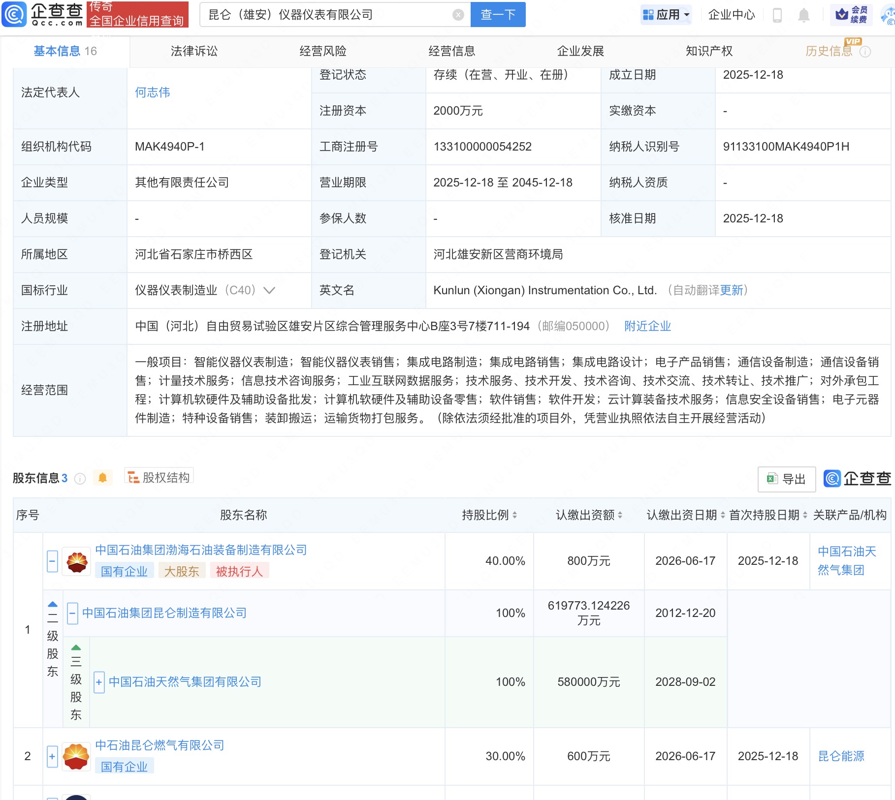 企查查APP显示,近日,昆仑(雄安)仪器仪表有限公司成立,法定代表人为何志伟,注册资本2000万人民币,经营范围含集成电路制造、集成电路销售、集成电路设计、电子产品销售、通信设备制造等。企查查股权穿透显示,该公司由中国石油天然气集团有限公司旗下中国石油集团渤海石油装备制造有限公司、中石油昆仑燃气有限公司、上海中核维思仪器仪表股份有限公司共同持股。