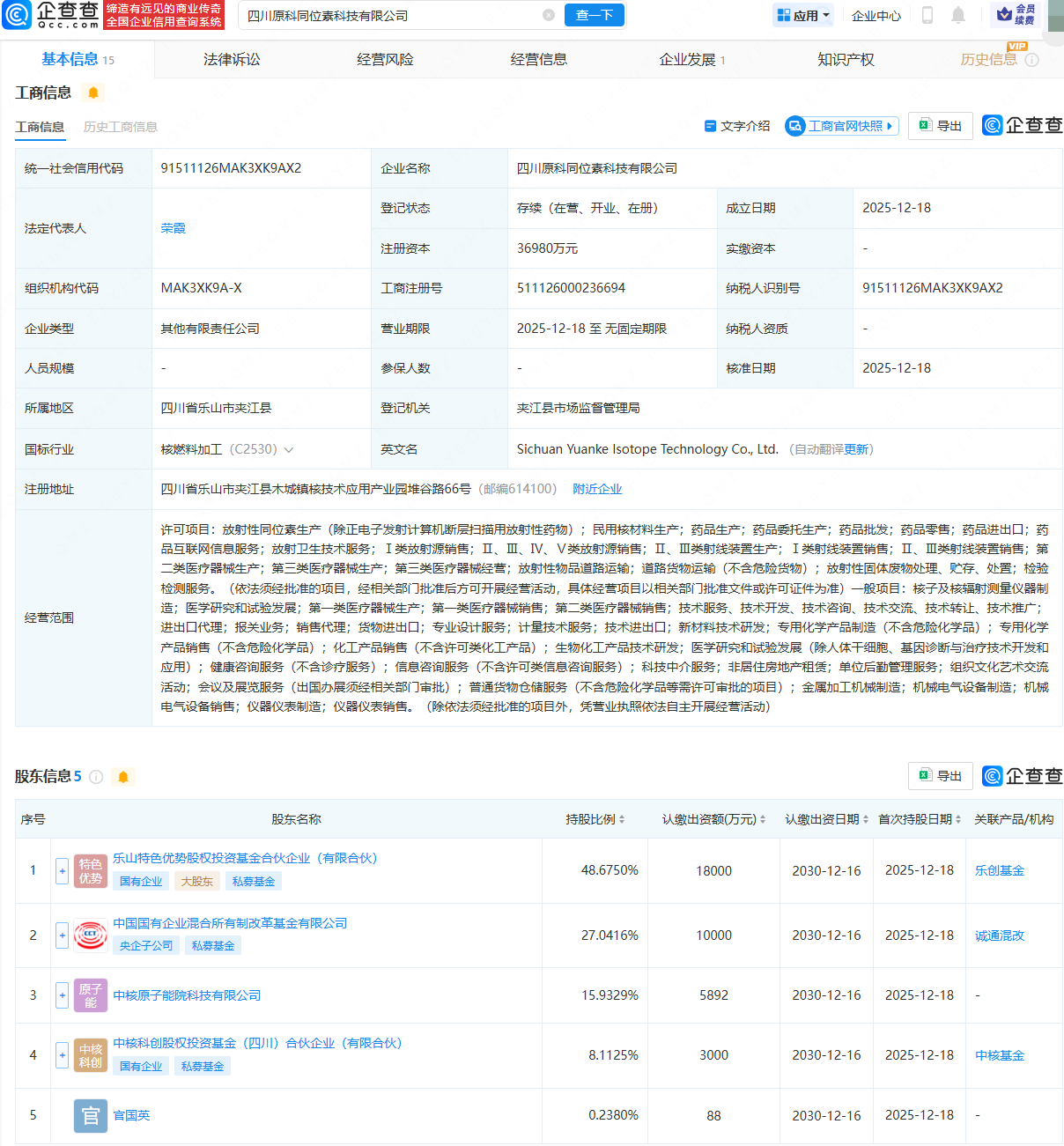 企查查APP显示,近日,四川原科同位素科技有限公司成立,法定代表人为荣霞,注册资本约为3.7亿元,经营范围包含:放射性同位素生产;民用核材料生产;药品生产;药品委托生产;药品批发;药品零售等。企查查股权穿透显示,该公司由乐山特色优势股权投资基金合伙企业(有限合伙)、中国国有企业混合所有制改革基金有限公司等共同持股。