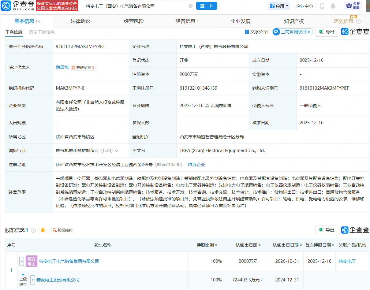 企查查APP显示,近日,特变电工(西安)电气装备有限公司成立,法定代表人为魏展培,注册资本为2000万元,经营范围包含:变压器、整流器和电感器制造;输配电及控制设备制造;电容器及其配套设备制造;电力电子元器件制造等。企查查股权穿透显示,该公司由特变电工(600089)间接全资持股。