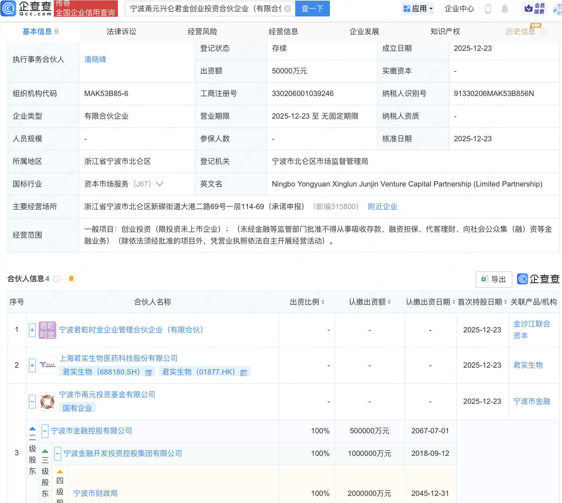 企查查APP显示,近日,宁波甬元兴仑君金创业投资合伙企业(有限合伙)成立,出资额5亿元,经营范围包含:创业投资(限投资未上市企业)。企查查股权穿透显示,该企业由君实生物(688180)、宁波市甬元投资基金有限公司等共同出资。