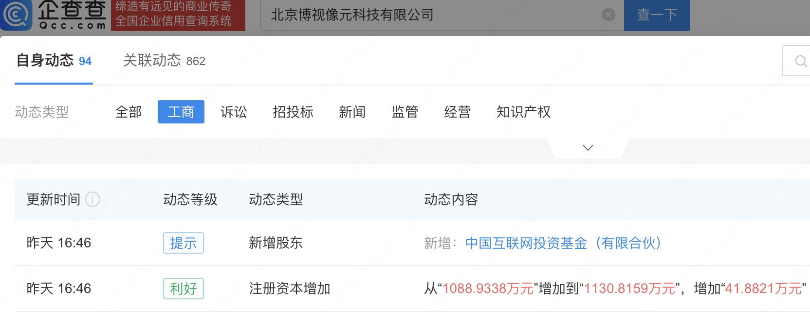 企查查APP显示,近日,北京博视像元科技有限公司发生工商变更,新增中国互联网投资基金(有限合伙)为股东,同时注册资本增至1130.82万元。企查查信息显示,该公司成立于2022年,法定代表人为朱江兵,经营范围包含:半导体器件专用设备制造;工业自动控制系统装置制造;光伏设备及元器件制造等。据其官网,博视像元是高性能机器视觉核心部件供应商。