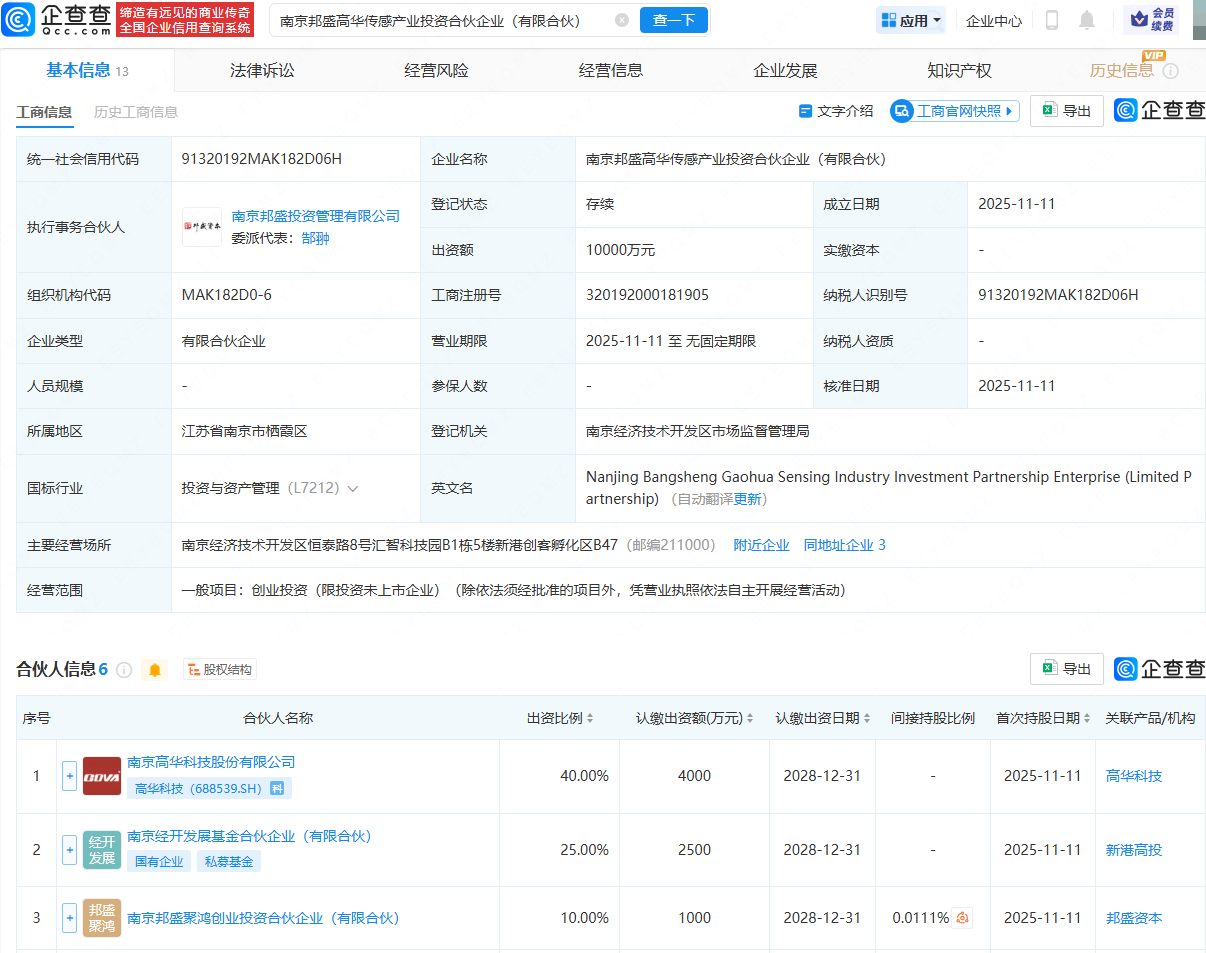 企查查APP显示,近日,南京邦盛高华传感产业投资合伙企业(有限合伙)成立,出资额1亿元,经营范围为创业投资(限投资未上市企业)。企查查股权穿透显示,该合伙企业由高华科技(688539)、南京经开发展基金合伙企业(有限合伙)等共同持股。