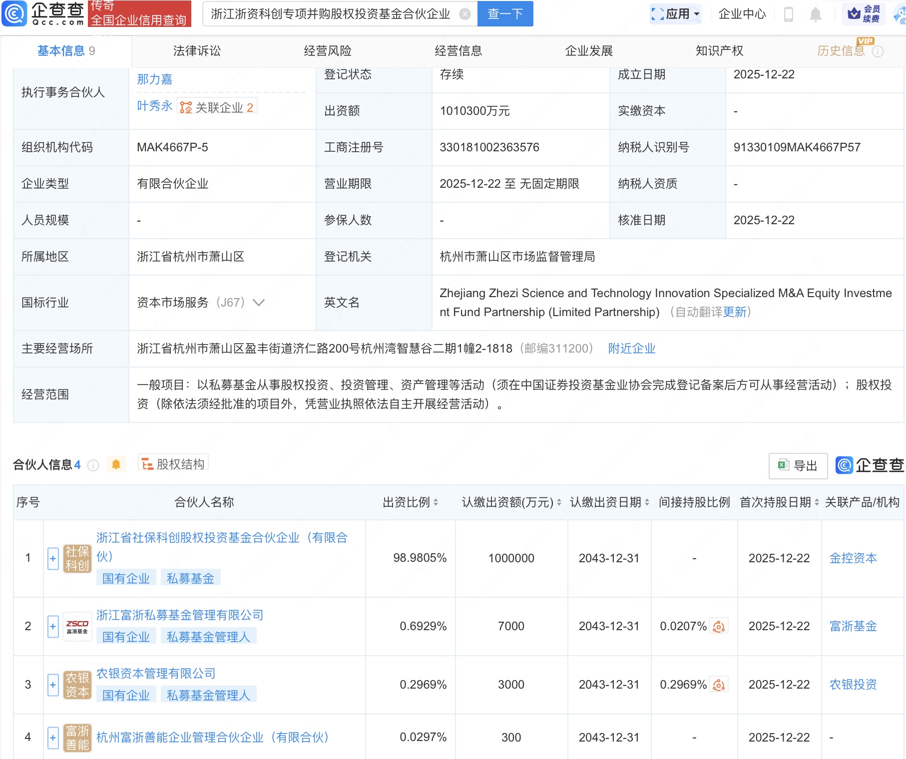 企查查APP显示,近日,浙江浙资科创专项并购股权投资基金合伙企业(有限合伙)成立,出资额101.03亿元,经营范围为以私募基金从事股权投资、投资管理、资产管理等活动。企查查股权穿透显示,该企业由浙江省社保科创股权投资基金合伙企业(有限合伙)、浙江富浙私募基金管理有限公司等共同出资。