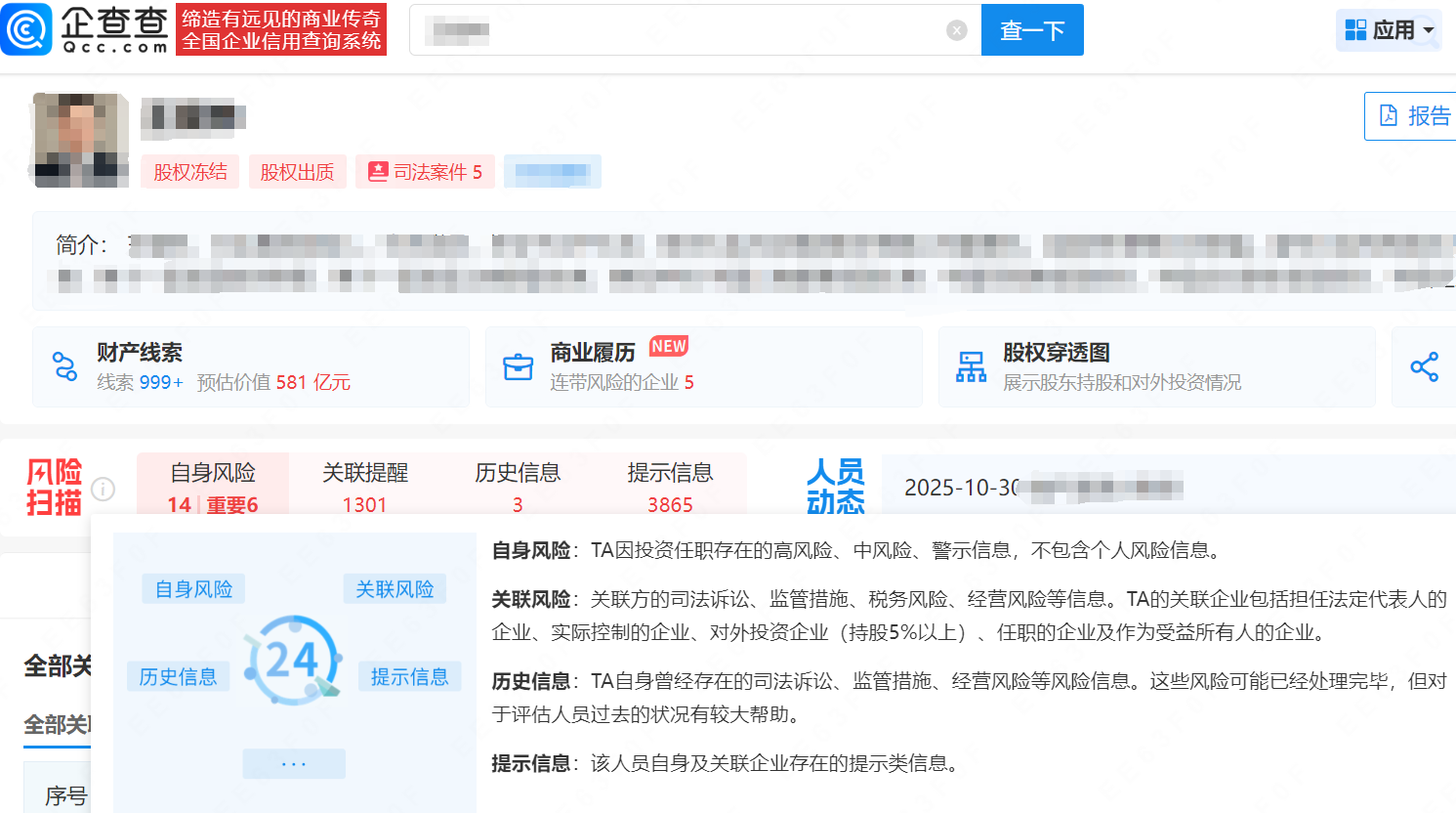 关联风险:关联企业的司法诉讼、税务问题、经营异常等信息,比如某网红担任法定代表人的公司有偷税处罚记录,也可以用企查查查到;