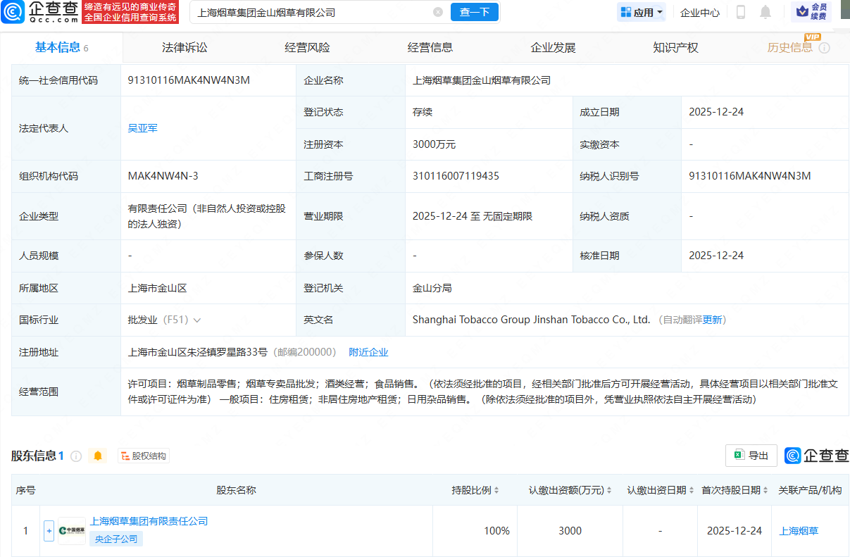 企查查APP显示,近日,上海烟草集团金山烟草有限公司、上海烟草集团静安烟草有限公司成立,注册资本均为3000万元,经营范围均包含:烟草制品零售;烟草专卖品批发;酒类经营;食品销售等。企查查股权穿透显示,两公司均由上海烟草集团有限责任公司全资持股。