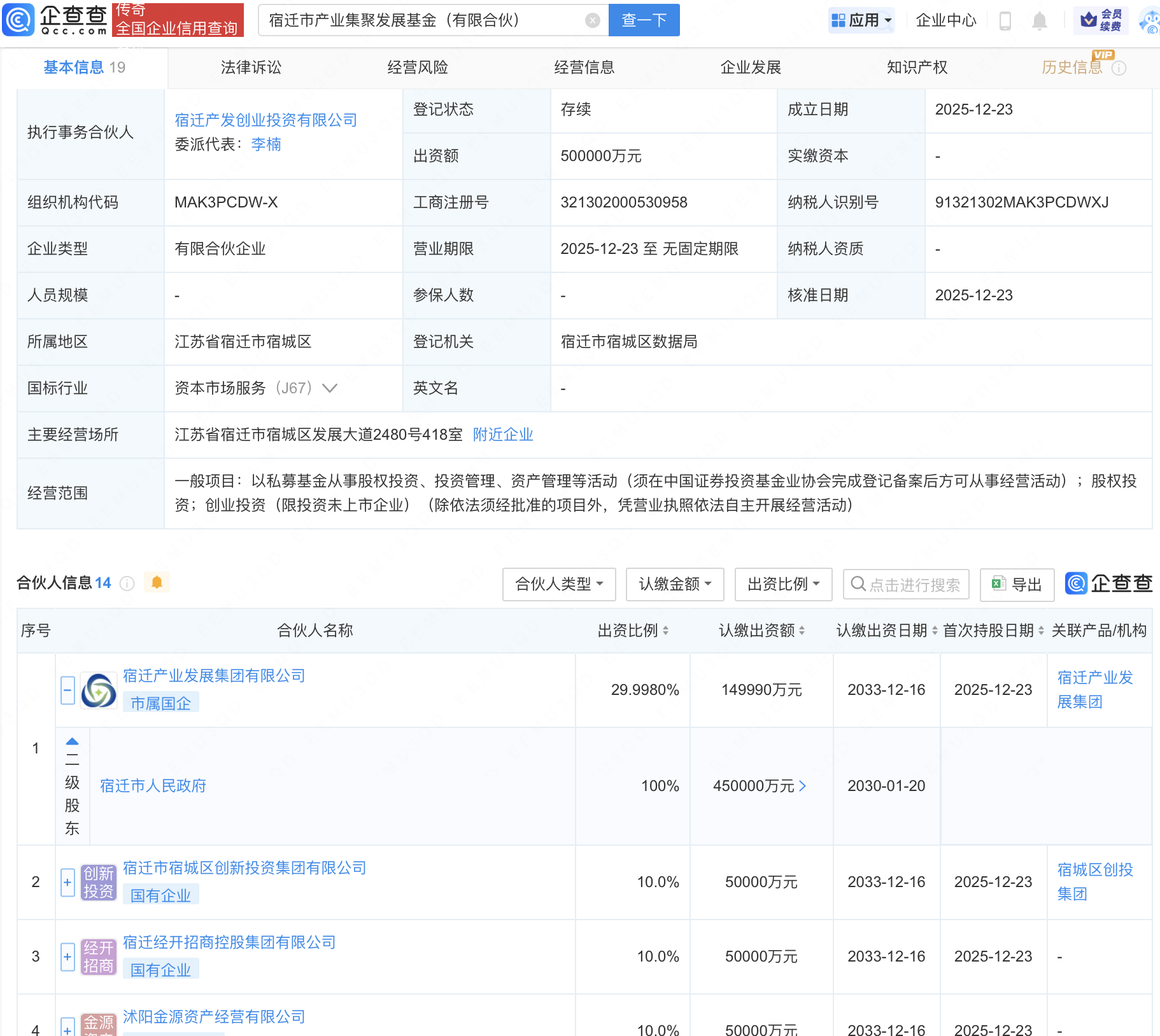 企查查APP显示,近日,宿迁市产业集聚发展基金(有限合伙)成立,出资额50亿元,经营范围包含:以私募基金从事股权投资、投资管理、资产管理等活动。企查查股权穿透显示,该企业由宿迁产业发展集团有限公司等共同出资。