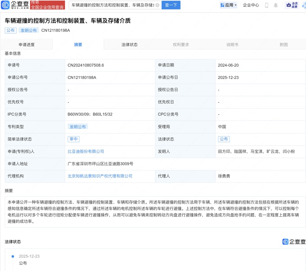 企查查APP显示,近日,比亚迪(002594)申请的“车辆避撞的控制方法和控制装置、车辆及存储介质”专利公布。企查查专利摘要显示,所述车辆避撞的控制方法用于车辆,所述车辆避撞的控制方法包括在根据所述车辆的感知信息确定所述车辆符合避撞条件的情况下,通过所述车辆的电机控制所述车辆的车轮进行避撞。上述控制方法中,在车辆符合避撞条件的情况下,可以控制每个电机运行以对多个车轮进行扭矩分配使车辆进行避撞操作,从而可以避免车辆来控制转动方向盘进行避撞操作,避免造成方向盘抢手的问题,在一定程度上提高车辆避撞的成功率。