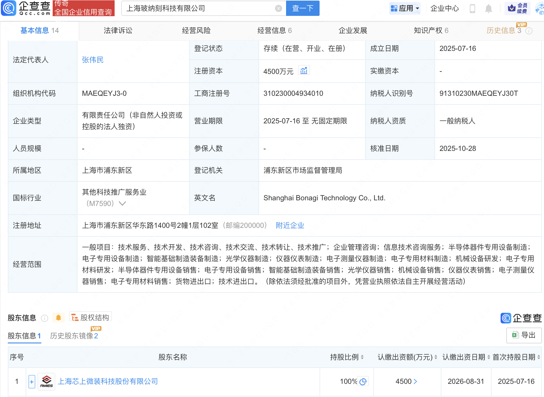 企查查APP显示,近日,上海玻纳刻科技有限公司中标8.6代有源矩阵有机发光显示器件生产线项目,招标人为合肥国显科技有限公司。企查查信息显示,上海玻纳刻科技有限公司成立于2025年7月,经营范围包含:半导体器件专用设备制造;电子专用设备制造;智能基础制造装备制造;光学仪器制造等,由上海芯上微装科技股份有限公司全资持股。公开信息显示,芯上微装是一家专注于高端半导体装备研发、生产和服务的科技企业,其核心业务包括光刻机的设计与制造。