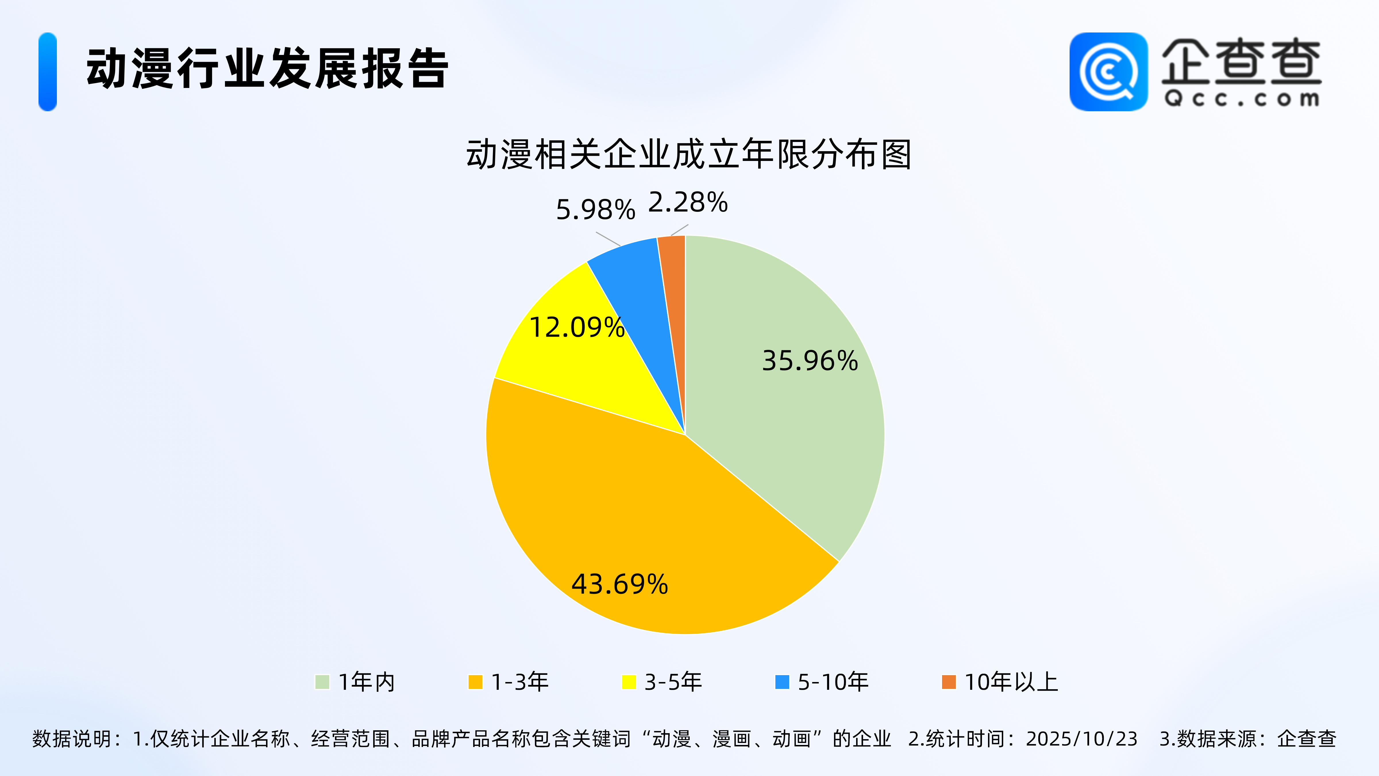 企查查数据显示,从经营时间来看,动漫相关企业多成立于近三年,成立年限在1-3年的相关企业最多,占比达43.69%。其次,成立年限在1年内的相关企业占比35.96%。
