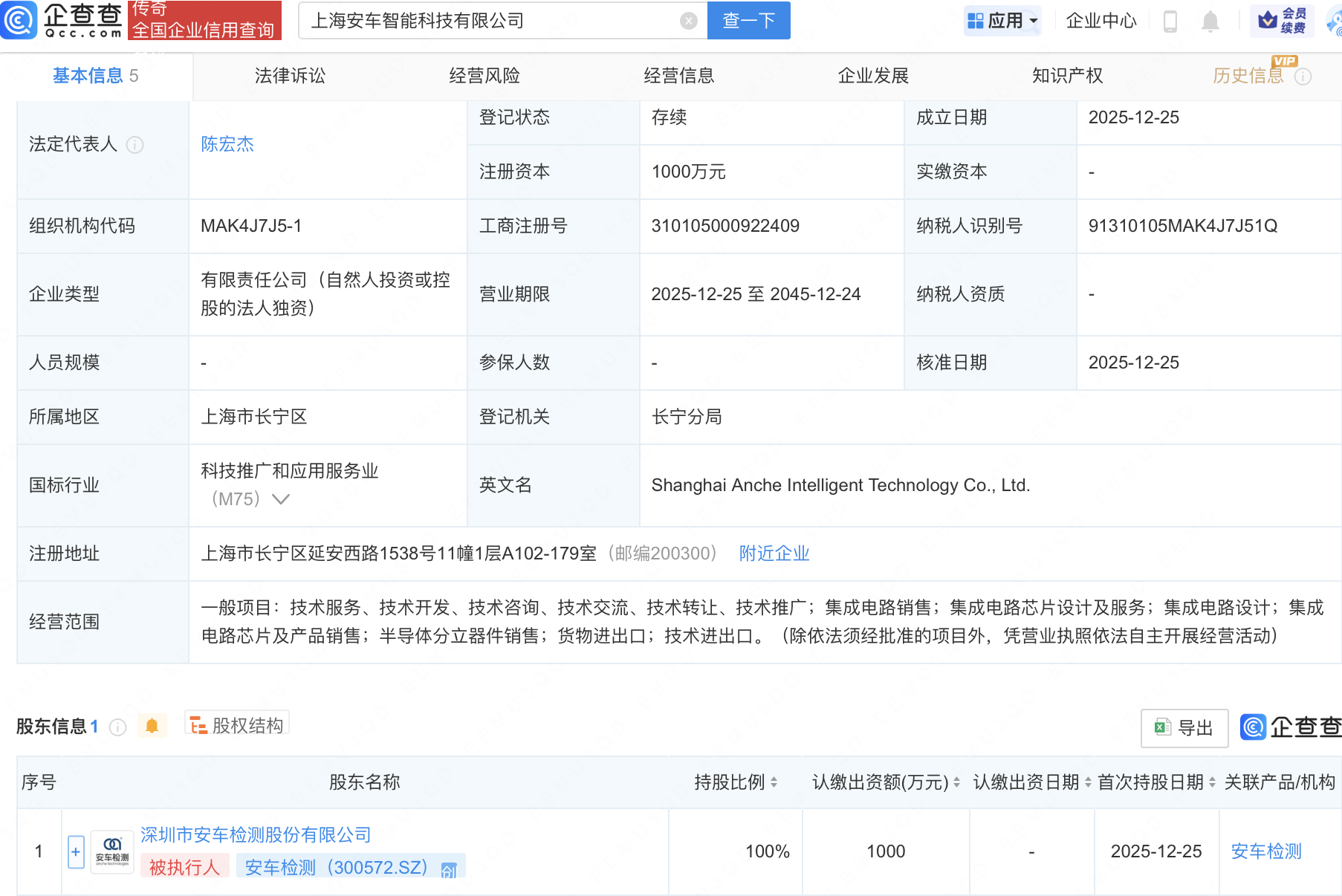企查查APP显示,近日,上海安车智能科技有限公司成立,注册资本1000万元,经营范围包含:集成电路销售;集成电路芯片设计及服务;集成电路设计;集成电路芯片及产品销售;半导体分立器件销售等。企查查股权穿透显示,该公司由安车检测(300572)全资持股。