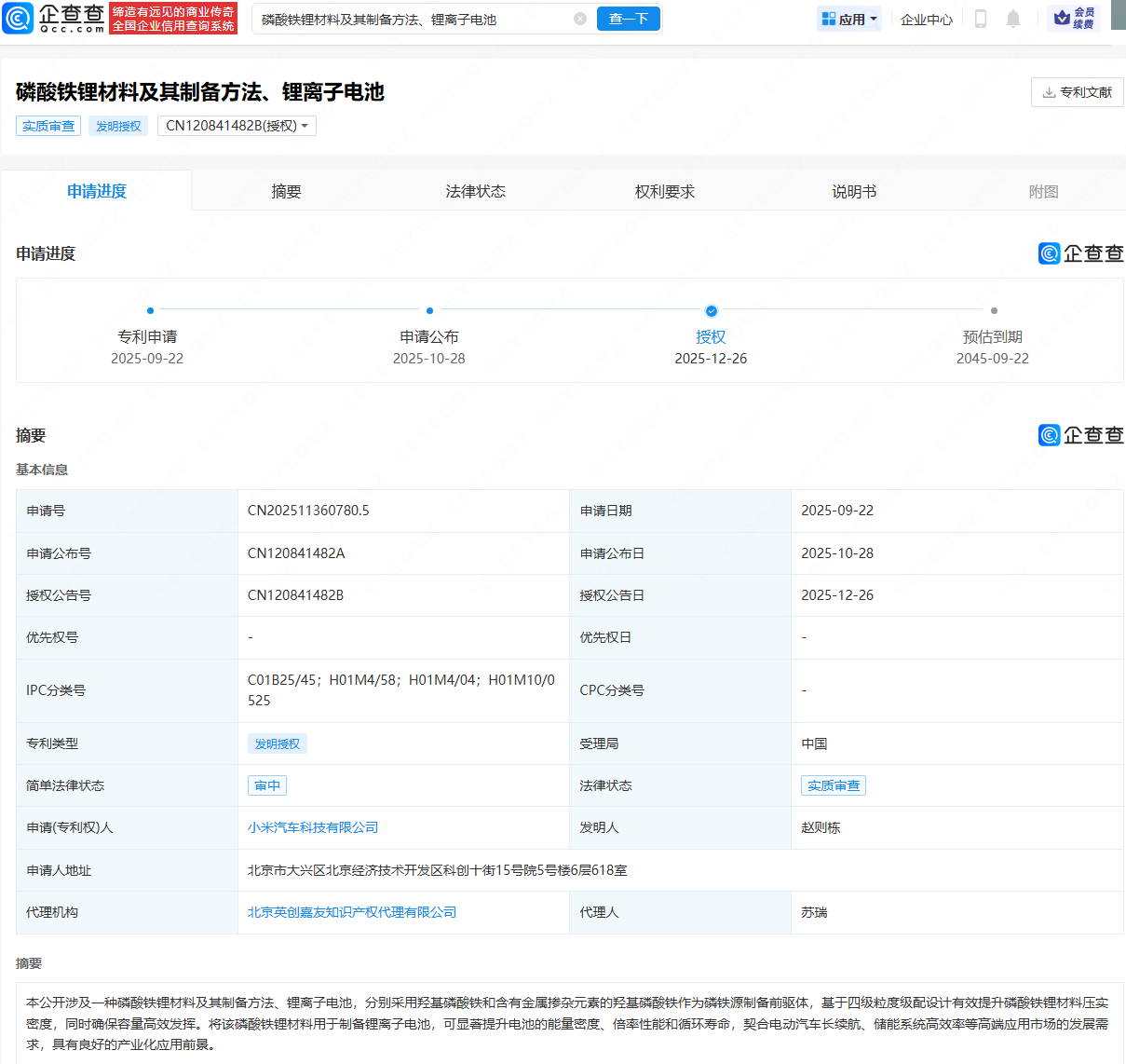 企查查APP显示,近日,小米汽车科技有限公司申请的“磷酸铁锂材料及其制备方法、锂离子电池”专利获授权。