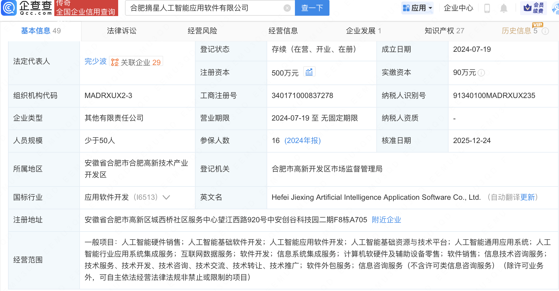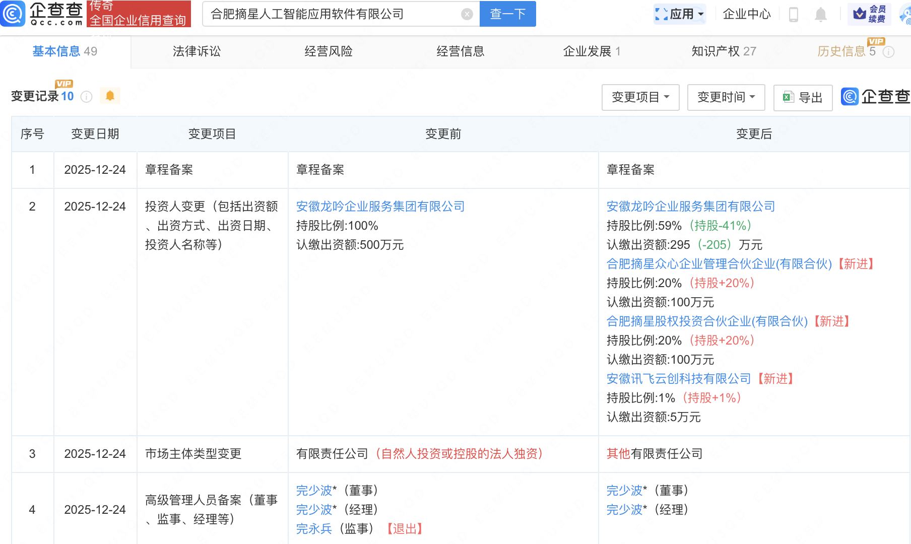 企查查APP显示,近日,合肥摘星人工智能应用软件有限公司发生工商变更,新增科大讯飞(002230)全资子公司安徽讯飞云创科技有限公司等为股东。企查查信息显示,该公司成立于2024年,法定代表人为完少波,经营范围包含:人工智能硬件销售;人工智能基础软件开发;人工智能应用软件开发;人工智能基础资源与技术平台等。