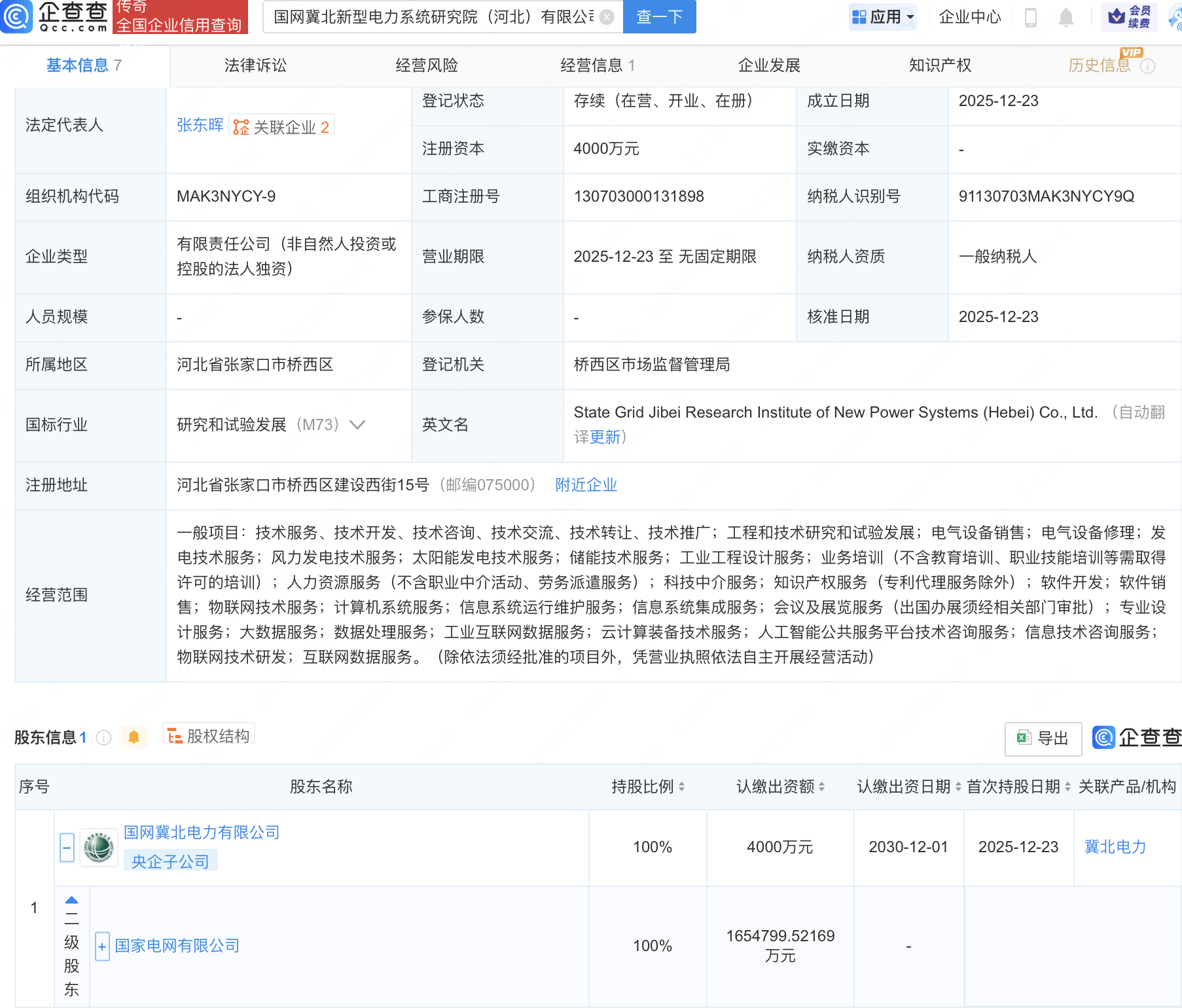 企查查APP显示,近日,国网冀北新型电力系统研究院(河北)有限公司成立,经营范围包含:大数据服务;数据处理服务;工业互联网数据服务;云计算装备技术服务;人工智能公共服务平台技术咨询服务等。企查查股权穿透显示,该公司由国家电网有限公司间接全资持股。