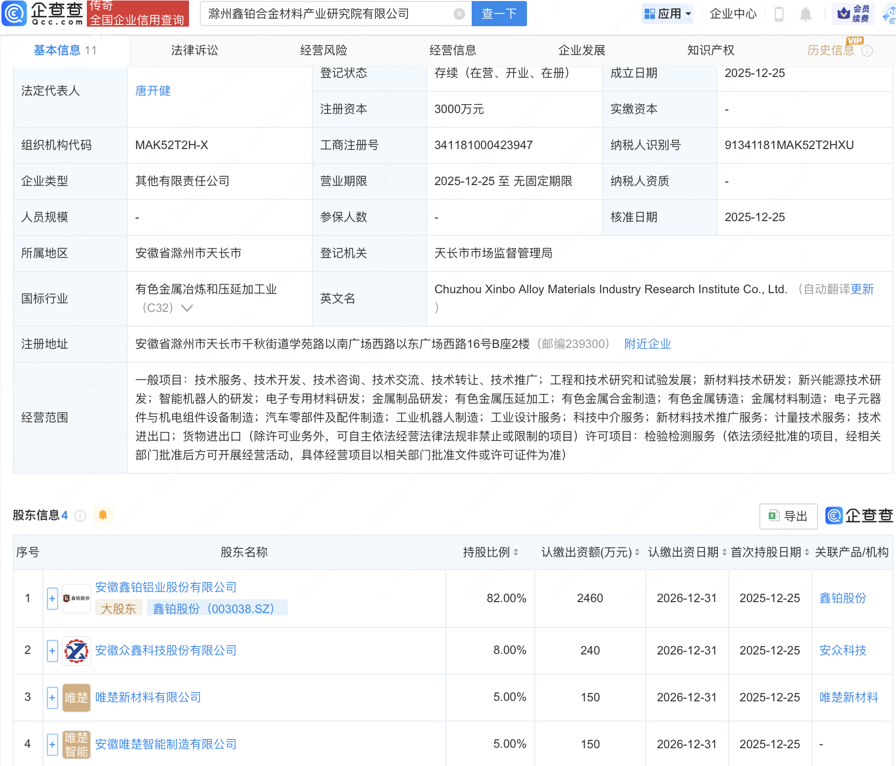 企查查APP显示,近日,滁州鑫铂合金材料产业研究院有限公司成立,注册资本3000万元,经营范围包含:新兴能源技术研发;智能机器人的研发;电子专用材料研发;金属制品研发等。企查查股权穿透显示,该公司由鑫铂股份(003038)等共同持股。