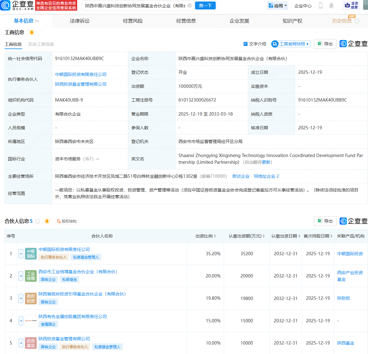 企查查APP显示,近日,陕西中赢兴盛科技创新协同发展基金合伙企业(有限合伙)成立,出资额10亿元,经营范围包含:以私募基金从事股权投资、投资管理、资产管理等活动。企查查股权穿透显示,该合伙企业由中银国际投资有限责任公司、陕西有色金属控股集团有限责任公司等共同持股。