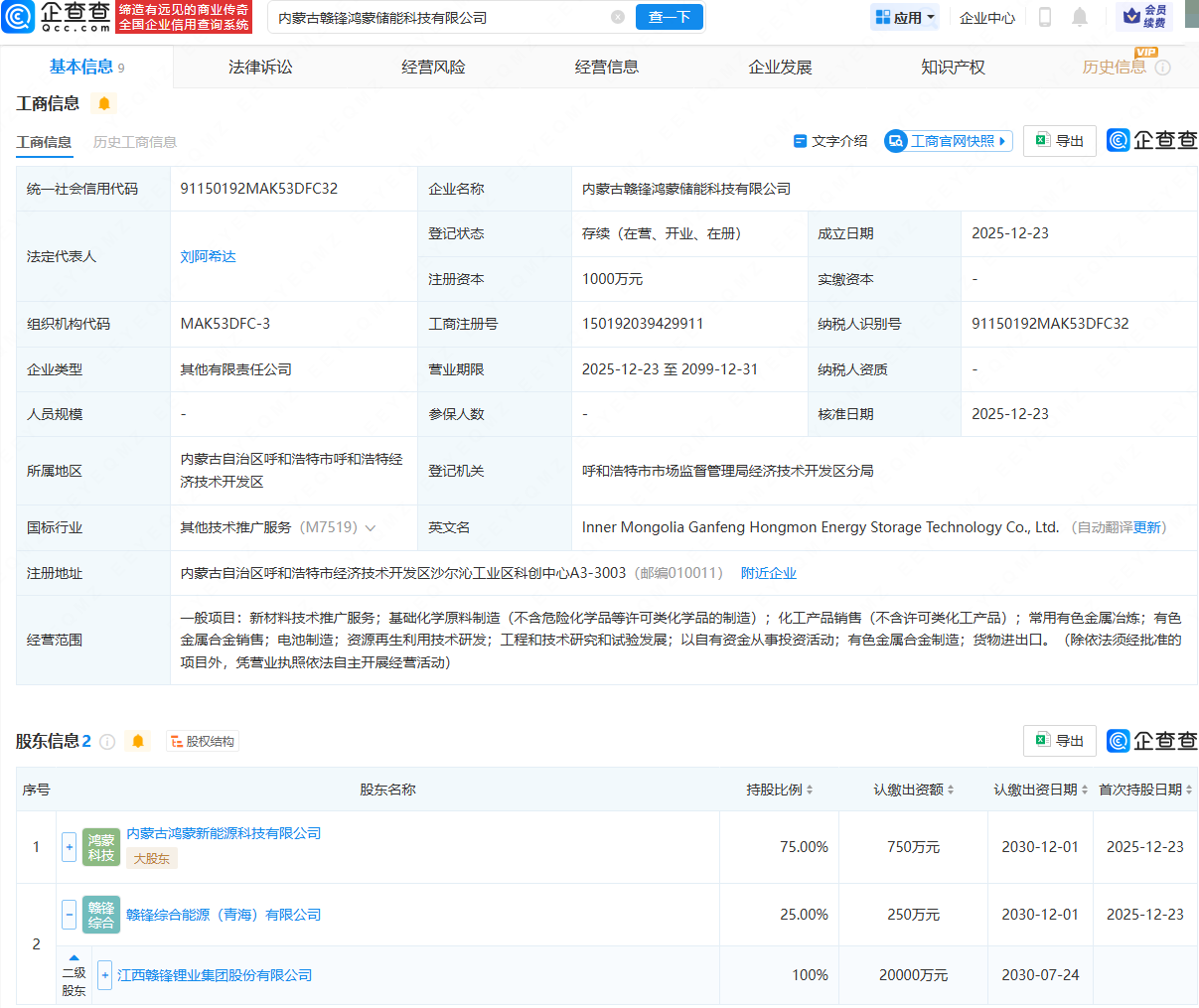 企查查APP显示,近日,内蒙古赣锋鸿蒙储能科技有限公司成立,法定代表人为刘阿希达,注册资本为1000万元,经营范围包含:新材料技术推广服务;常用有色金属冶炼;有色金属合金销售;电池制造;资源再生利用技术研发等。企查查股权穿透显示,该公司由内蒙古鸿蒙新能源科技有限公司、赣锋锂业(002460)全资子公司赣锋综合能源(青海)有限公司共同持股。