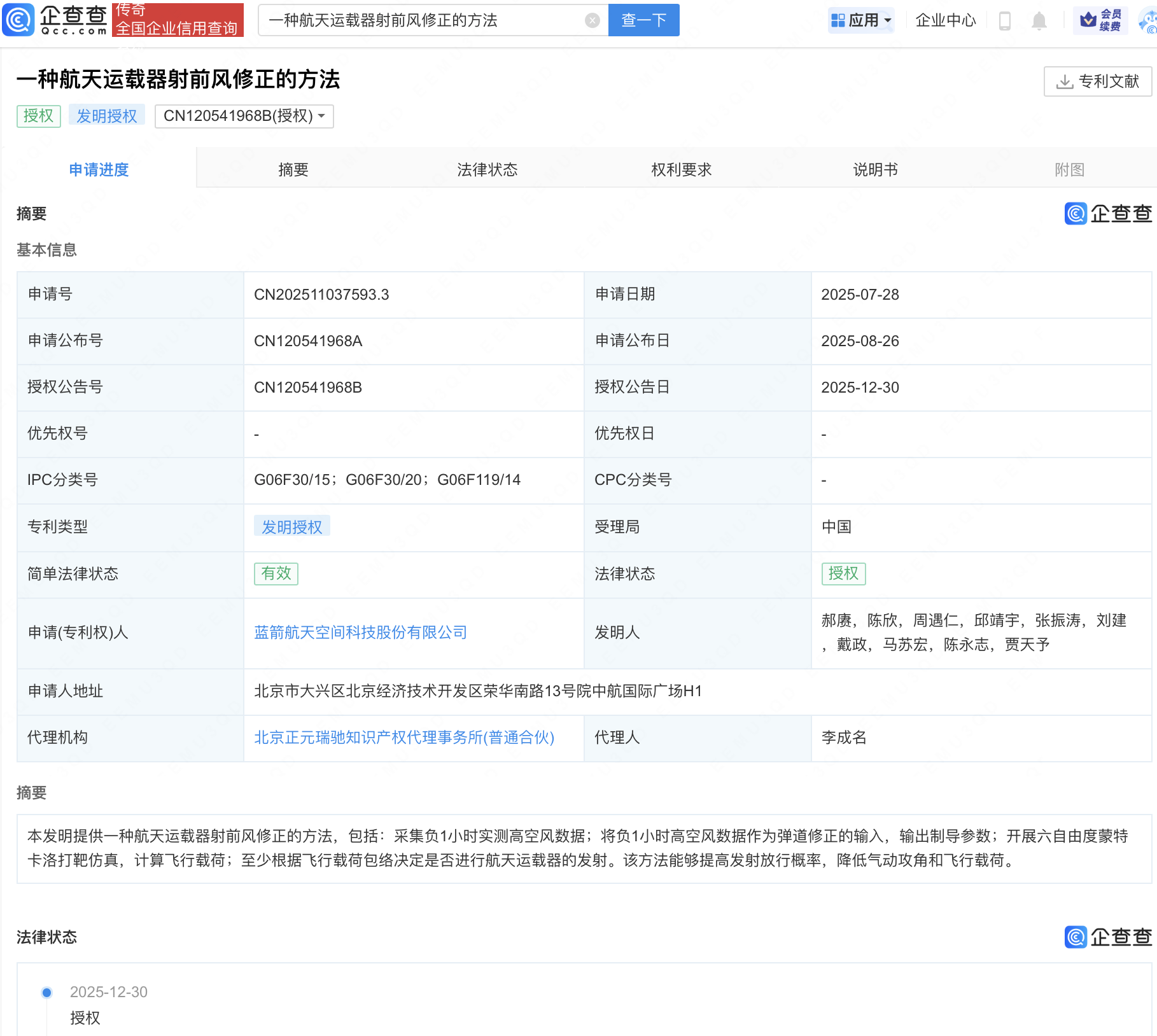 蓝箭航天航天运载器相关专利获授权,可提高发射放行概率