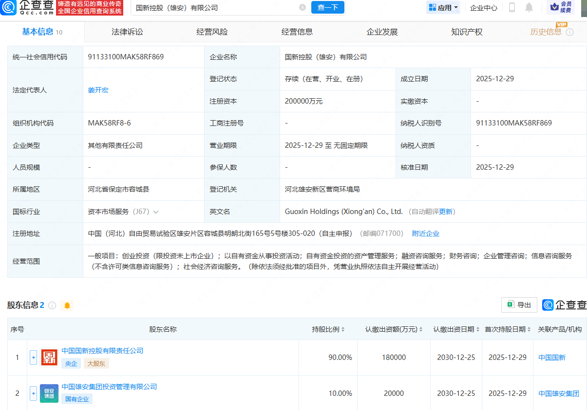 企查查APP显示,近日,国新控股(雄安)有限公司成立,法定代表人为姜开宏,注册资本为20亿元,经营范围包含:创业投资(限投资未上市企业);以自有资金从事投资活动;自有资金投资的资产管理服务;融资咨询服务等。企查查股权穿透显示,该公司由中国国新控股有限责任公司、中国雄安集团投资管理有限公司共同持股。