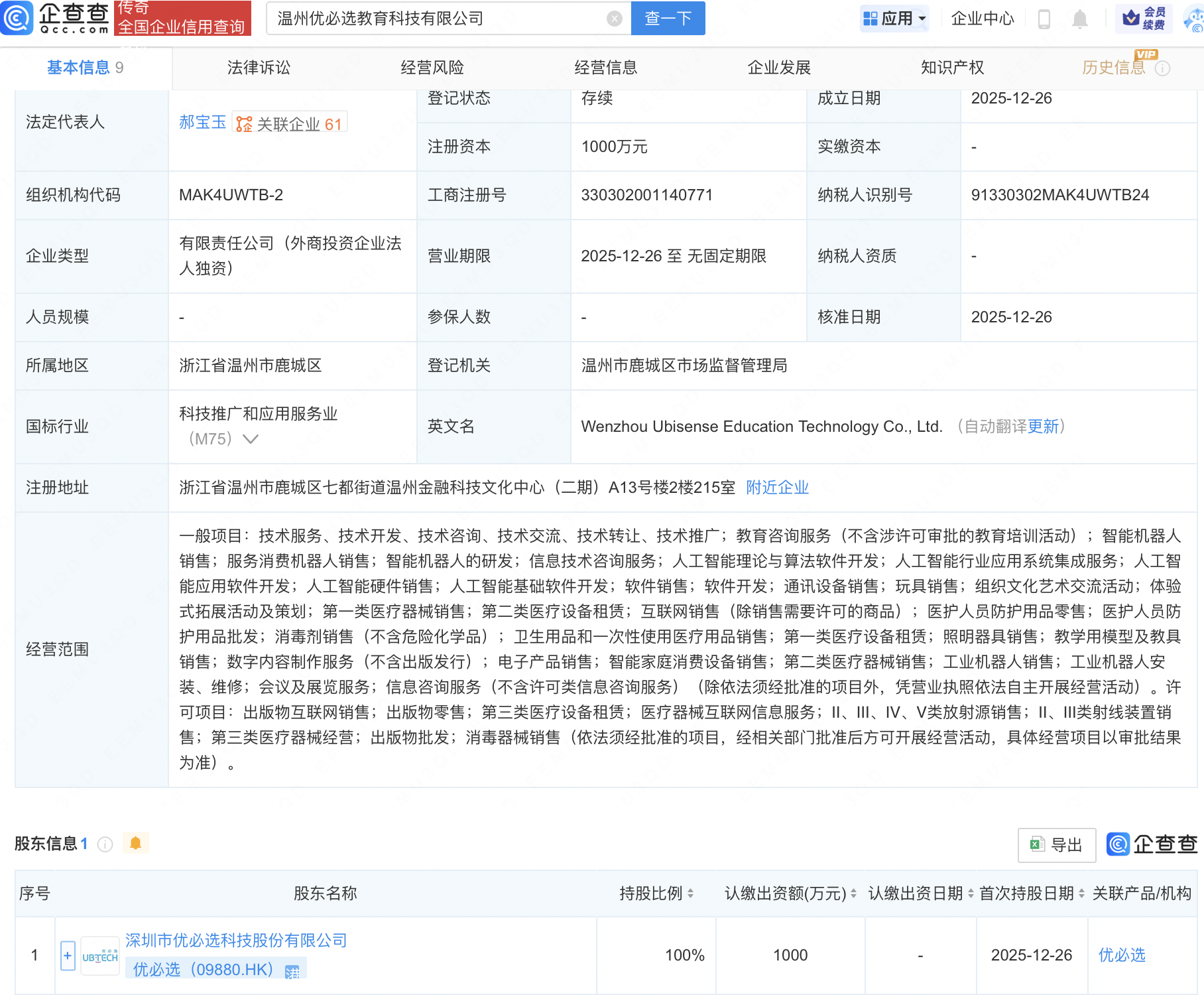 企查查APP显示,近日,温州优必选教育科技有限公司成立,经营范围包含:人工智能理论与算法软件开发;人工智能行业应用系统集成服务;人工智能应用软件开发;人工智能硬件销售等。企查查股权穿透显示,该公司由优必选(09880.HK)全资持股。