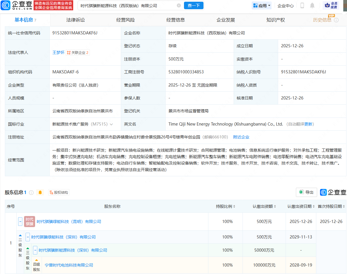 企查查APP显示,近日,时代骐骥新能源科技(西双版纳)有限公司成立,法定代表人为王梦怀,经营范围包含:新兴能源技术研发;新能源汽车换电设施销售;电池销售;集中式快速充电站;机动车充电销售等。企查查股权穿透显示,该公司由宁德时代(300750)旗下时代骐骥绿能科技(昆明)有限公司全资持股。