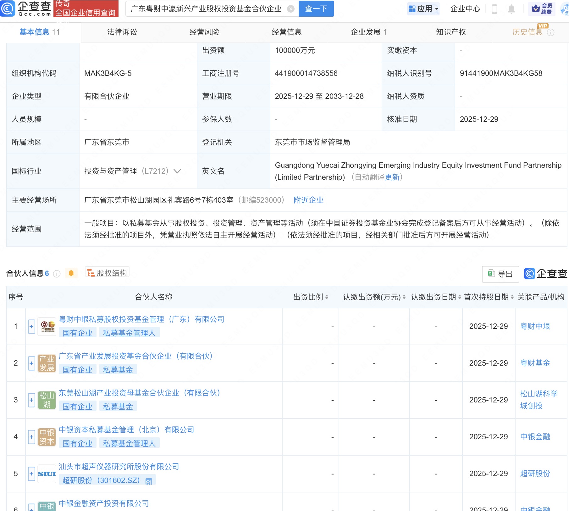 企查查APP显示,近日,广东粤财中瀛新兴产业股权投资基金合伙企业(有限合伙)成立,出资额10亿人民币,经营范围为以私募基金从事股权投资、投资管理、资产管理等活动。企查查股权穿透显示,该企业由超研股份(301602)、中银金融资产投资有限公司、中银资本私募基金管理(北京)有限公司等共同出资。