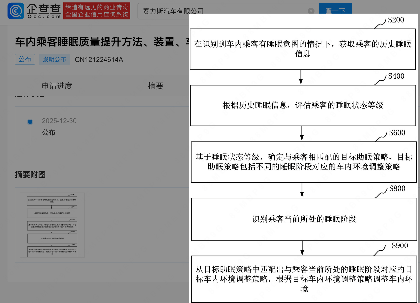 企查查APP显示,近日,赛力斯汽车有限公司申请的“车内乘客睡眠质量提升方法、装置、车辆和计算机设备”专利公布。
