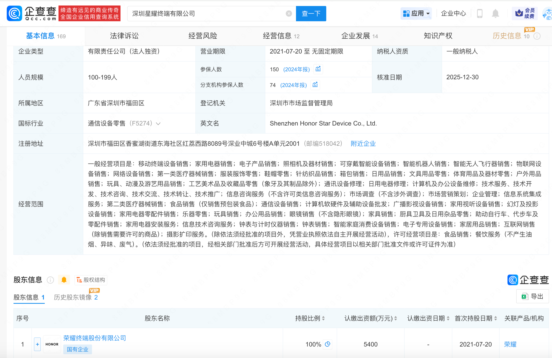 企查查APP显示,近日,深圳星耀终端有限公司发生工商变更,注册资本由400万人民币增至5400万人民币,增幅1250%。企查查信息显示,该公司成立于2021年7月,法定代表人为文洁,经营范围含移动终端设备销售、家用电器销售、电子产品销售等,由荣耀终端股份有限公司全资持股。