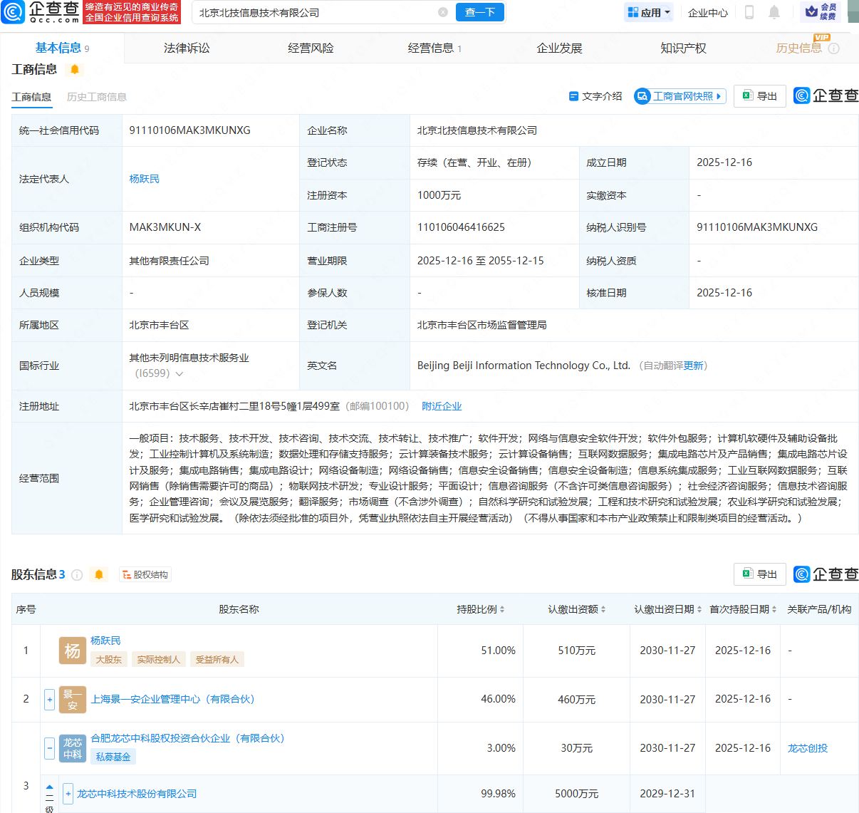 企查查APP显示,近日,北京北技信息技术有限公司成立,法定代表人为杨跃民,注册资本为1000万元,经营范围包含:云计算装备技术服务;集成电路芯片及产品销售;集成电路芯片设计及服务;集成电路销售;集成电路设计等。企查查股权穿透显示,该公司由杨跃民、龙芯中科(688047)旗下合肥龙芯中科股权投资合伙企业(有限合伙)等共同持股。