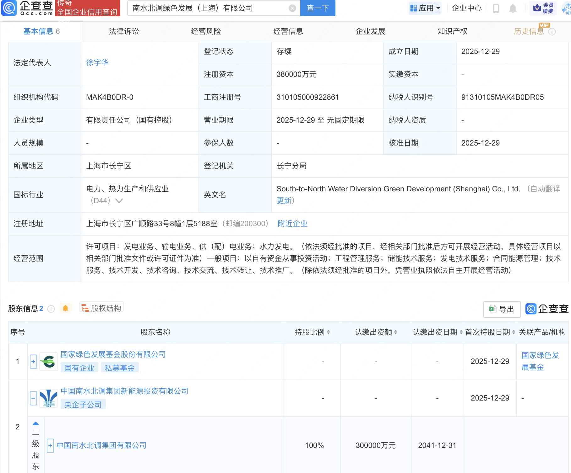 企查查APP显示,近日,南水北调绿色发展(上海)有限公司成立,注册资本38亿元,经营范围包含:工程管理服务;储能技术服务;发电技术服务;合同能源管理等。企查查股权穿透显示,该公司由国家绿色发展基金股份有限公司、中国南水北调集团有限公司全资子公司中国南水北调集团新能源投资有限公司共同持股。