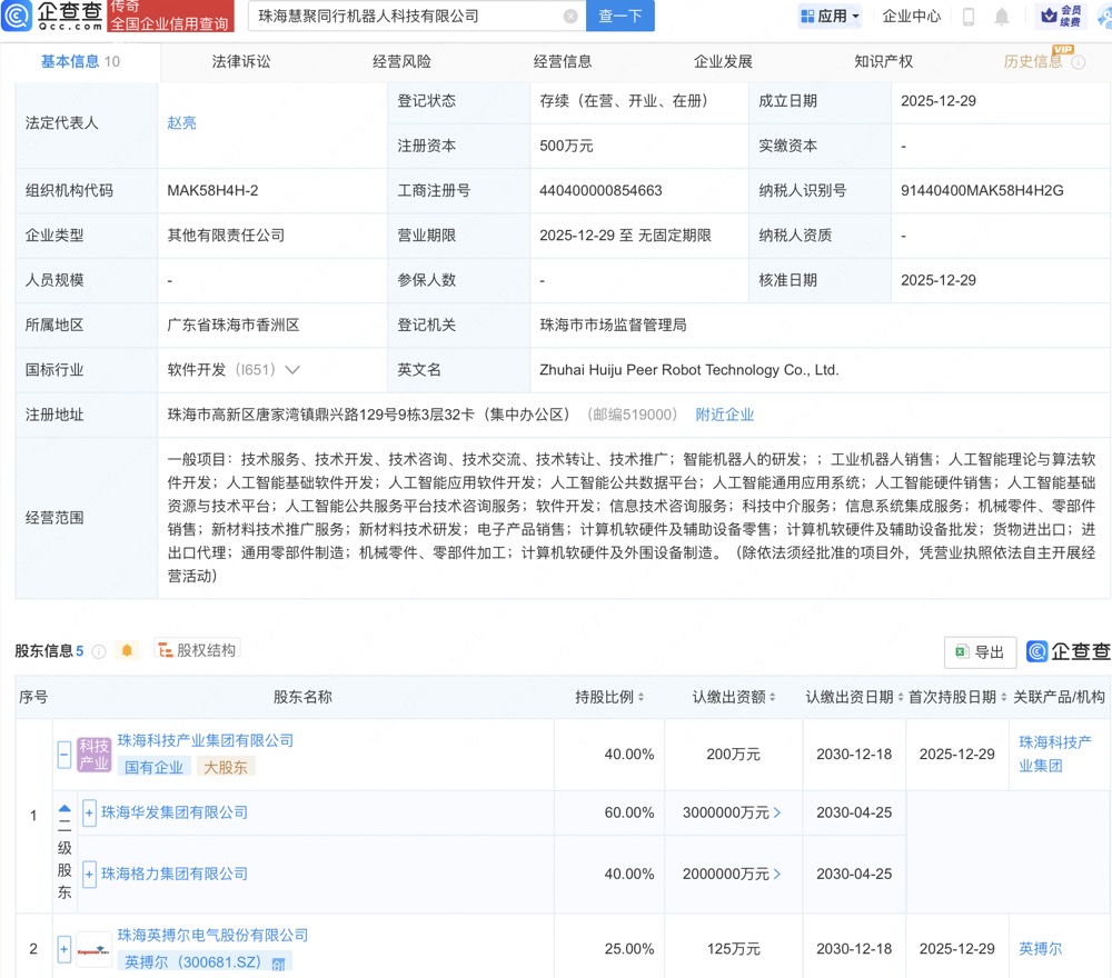 企查查APP显示,近日,珠海慧聚同行机器人科技有限公司成立,经营范围包含:智能机器人的研发;工业机器人销售;人工智能应用软件开发;人工智能公共数据平台;人工智能通用应用系统等。企查查股权穿透显示,该公司由珠海华发集团有限公司旗下珠海科技产业集团有限公司、英搏尔(300681)等共同持股。