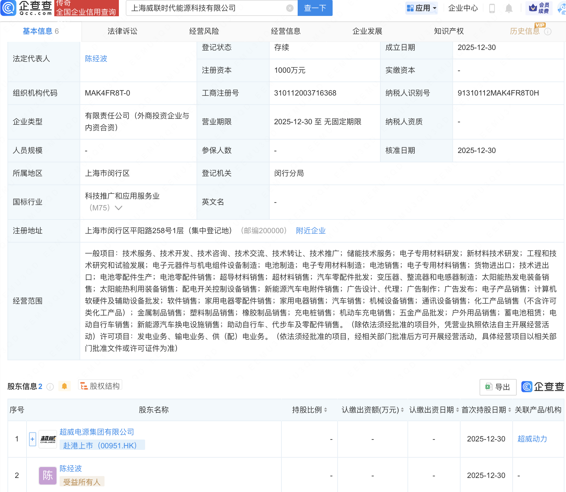 企查查APP显示,近日,上海威联时代能源科技有限公司成立,经营范围包含:充电桩销售;机动车充电销售;蓄电池租赁;新能源汽车换电设施销售等。企查查股权穿透显示,该公司由超威电源集团有限公司等共同持股。