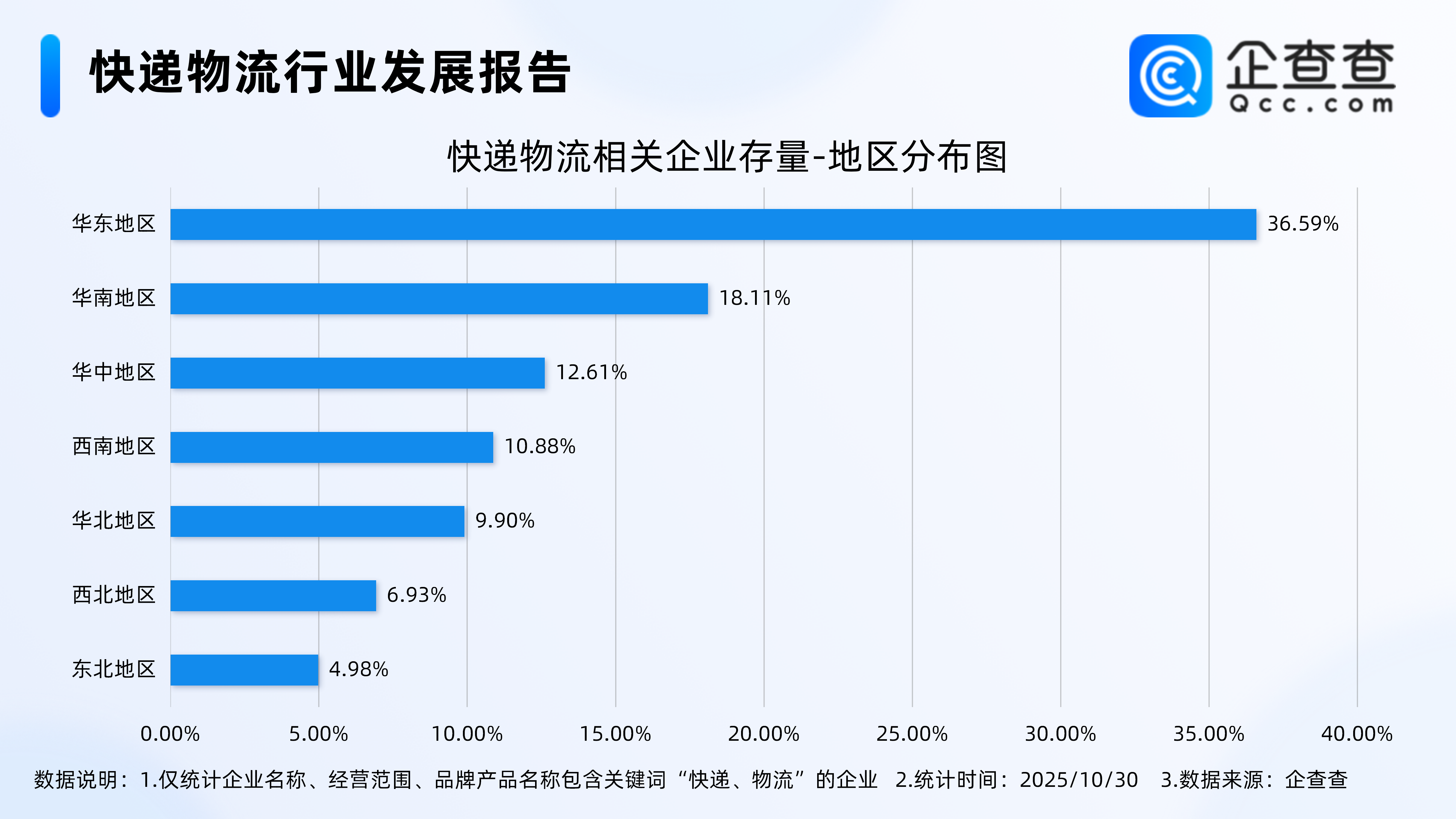 企查查数据显示,从地区分布来看,快递物流相关企业主要集中分布在华东地区,占比达36.59%。其次,分布在华南地区、华中地区的相关企业分别占比18.11%、12.61%。