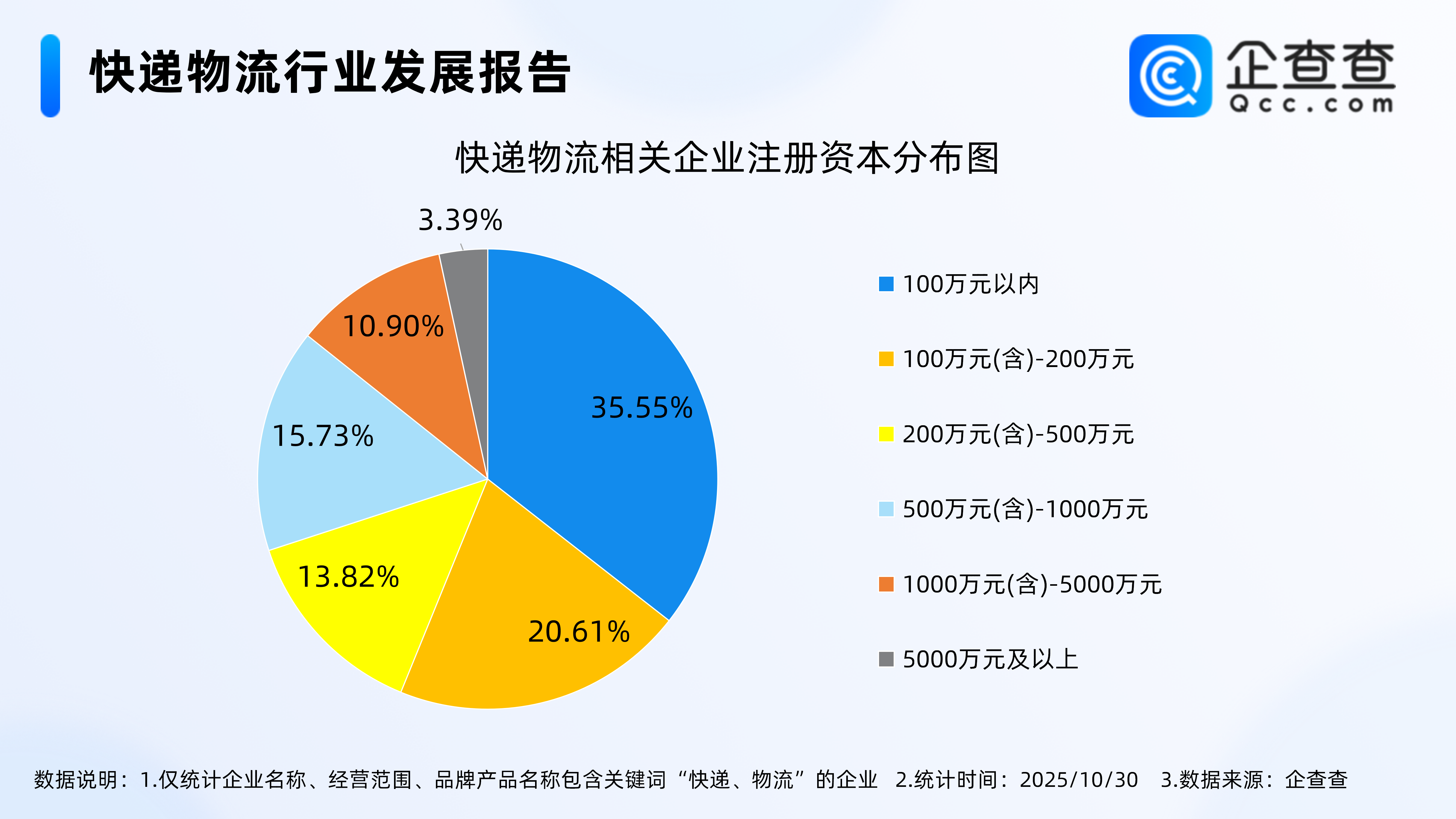 企查查数据显示,从注册资本分布来看,快递物流相关企业多为轻量级企业,注册资本在100万元以内的相关企业最多,占比35.55%。其次,注册资本在100万元(含)-200万元的相关企业占比20.61%。
