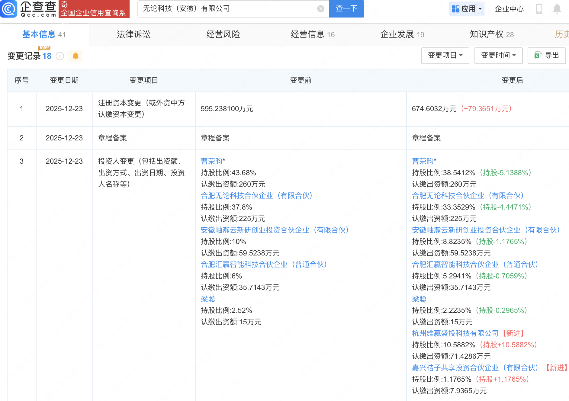 企查查APP显示,近日,无论科技(安徽)有限公司发生工商变更,新增滴滴关联公司北京小桔科技集团有限公司旗下嘉兴桔子共享投资合伙企业(有限合伙)等为股东,同时注册资本增至674.6万元。企查查信息显示,该公司成立于2023年,经营范围包含:智能机器人的研发;智能机器人销售;人工智能基础软件开发等。公开信息显示,无论科技深耕具身智能领域,致力于创新人机交互方式,专注于提供多模态情感交互机器人的软硬件解决方案,打造具备“生命力”的机器人。