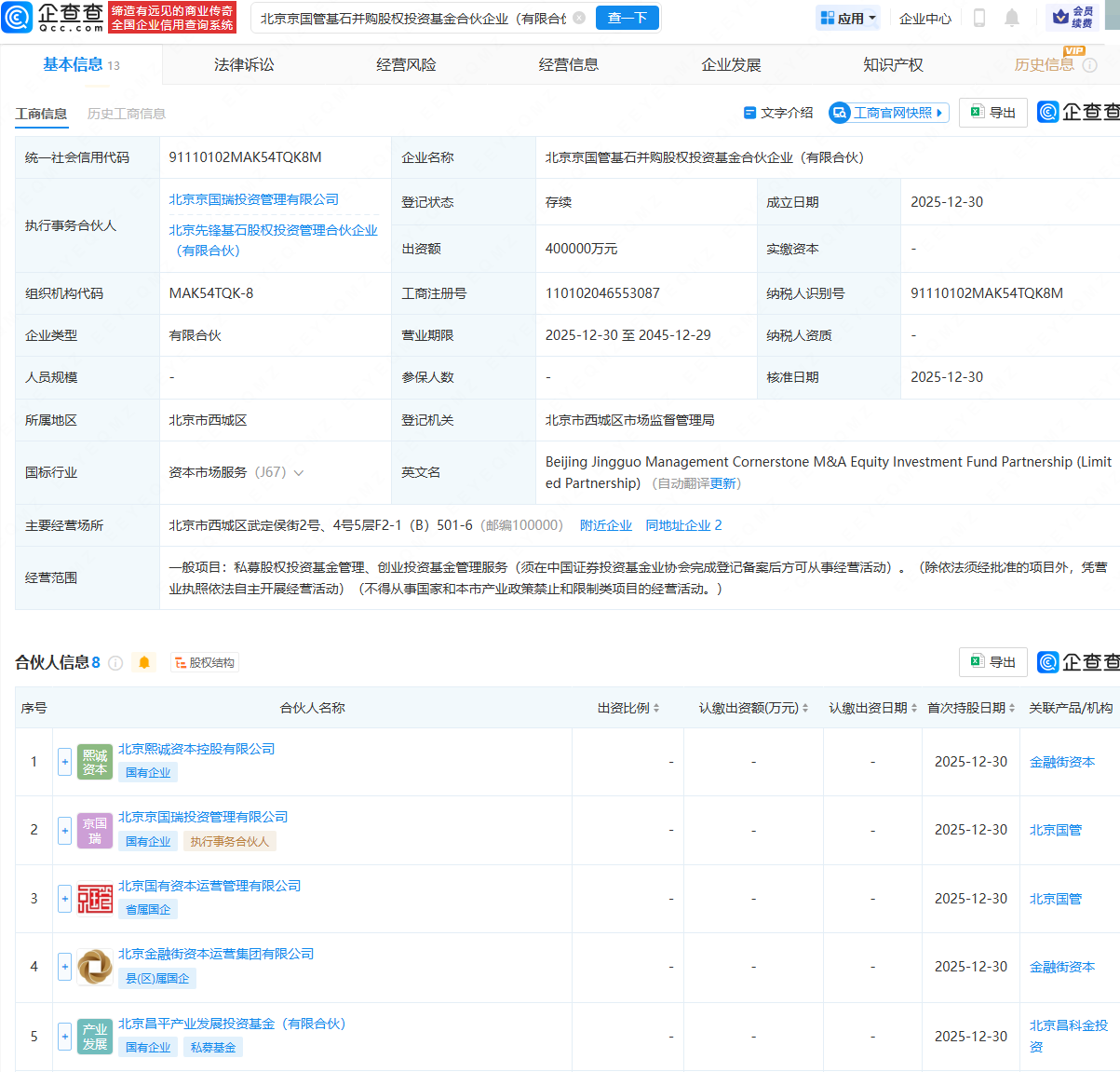 企查查APP显示,近日,北京京国管基石并购股权投资基金合伙企业(有限合伙)成立,出资额40亿元,经营范围包含:私募股权投资基金管理、创业投资基金管理服务。企查查股权穿透显示,该合伙企业由北京国有资本运营管理有限公司、北京金融街资本运营集团有限公司等共同出资。