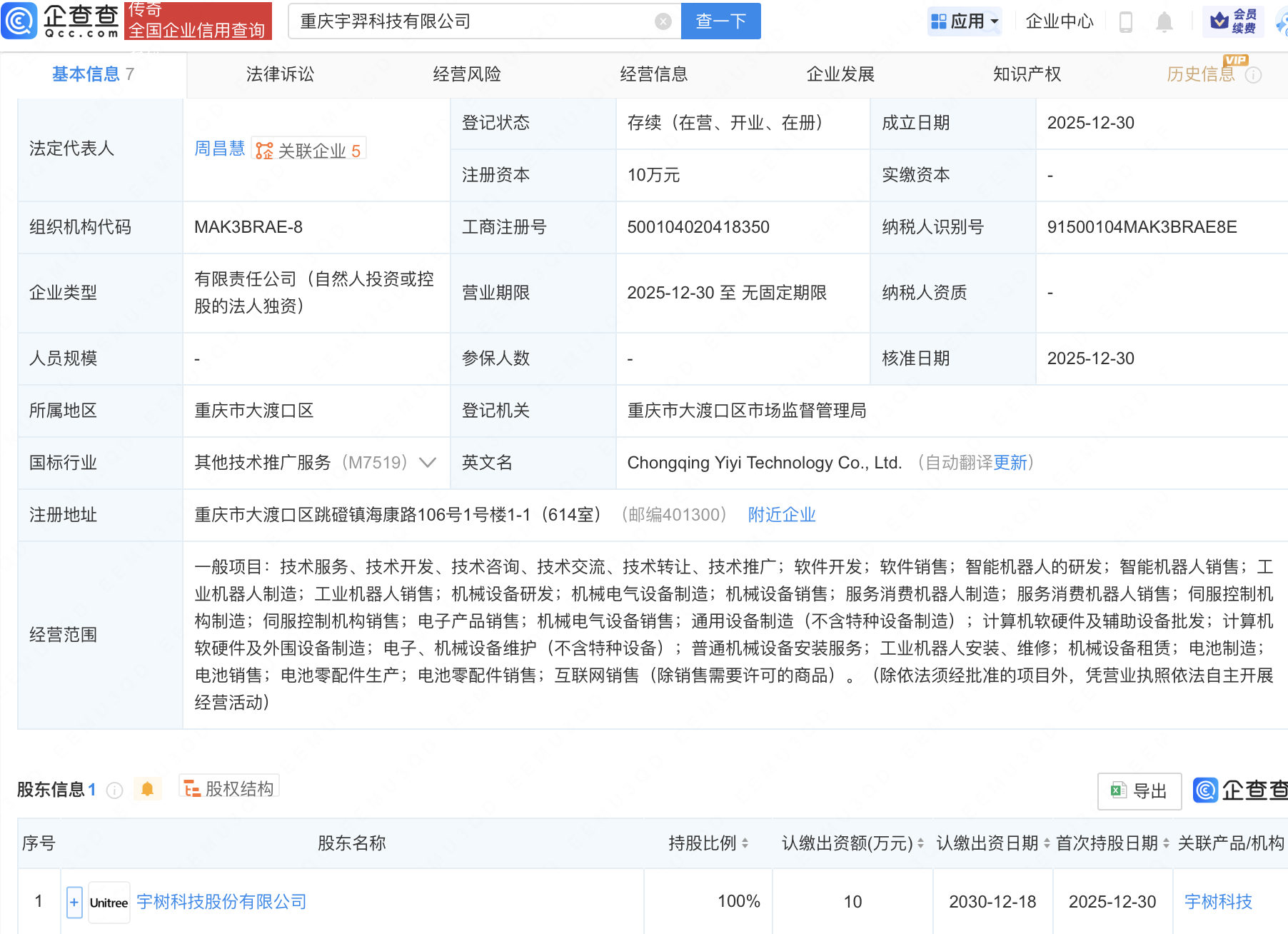 企查查APP显示,近日,重庆宇羿科技有限公司成立,经营范围包含:智能机器人的研发;智能机器人销售;工业机器人制造;工业机器人销售;机械设备研发等。企查查股权穿透显示,该公司由宇树科技股份有限公司全资持股。