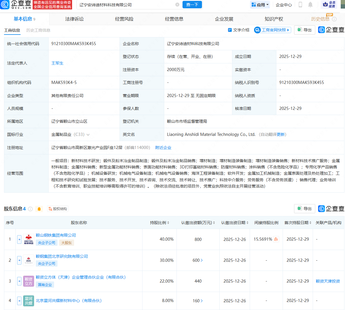 企查查APP显示,近日,辽宁安诗迪材料科技有限公司成立,法定代表人为王军生,注册资本为2000万元,经营范围包含:新材料技术研发;锻件及粉末冶金制品制造;增材制造;增材制造装备制造;增材制造装备销售等。企查查股权穿透显示,该公司由鞍钢集团旗下鞍山钢铁集团有限公司、鞍钢集团北京研究院有限公司等共同持股。