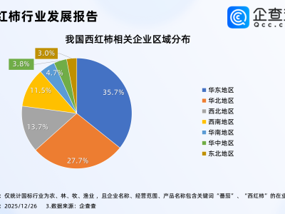 企查查数据显示,从地区分布来看,食品添加剂相关企业主要集中分布在华东地区,占比高达41.66%。其次,分布在华南地区、华中地区的相关企业分别占比15.11%、13.38%。其余地区占比均不足10%。