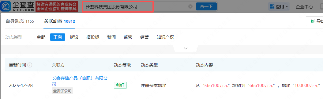 企查查APP显示,近日,长鑫存储产品(合肥)有限公司发生工商变更,注册资本从56.61亿元增加到66.61亿元,增幅约为17.67%。