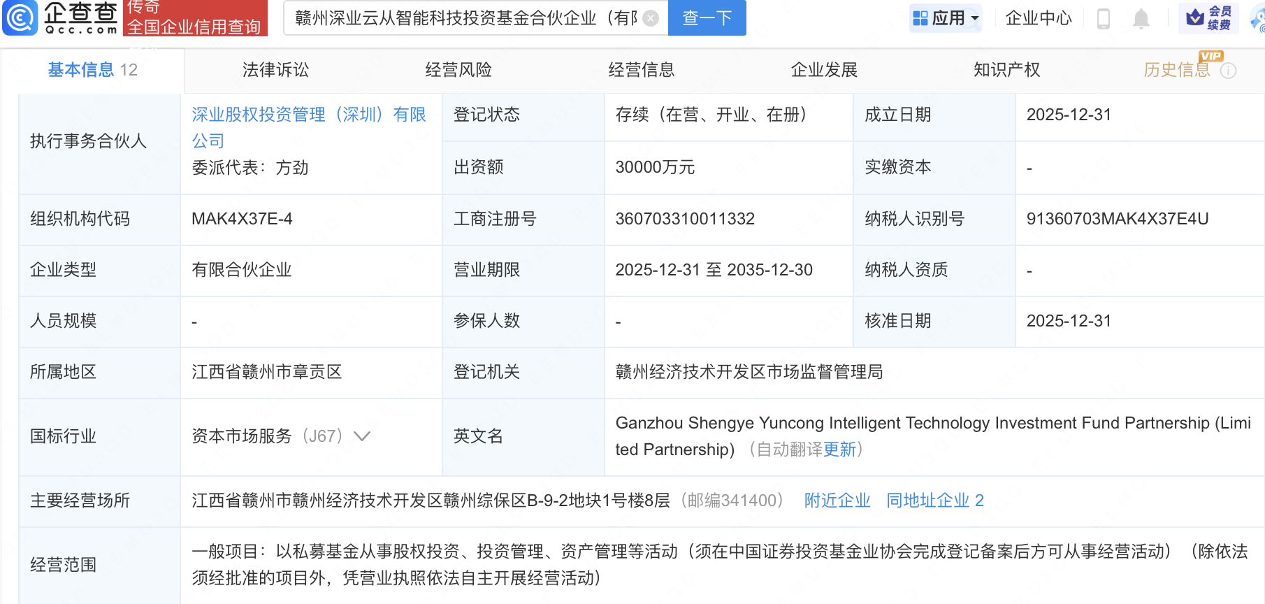 企查查APP显示,近日,赣州深业云从智能科技投资基金合伙企业(有限合伙)成立,出资额3亿元,经营范围包含:以私募基金从事股权投资、投资管理、资产管理等活动。企查查股权穿透显示,该企业由深业资本(深圳)有限公司、云从科技(688327)全资子公司广州云从长嬴投资有限公司等共同出资。