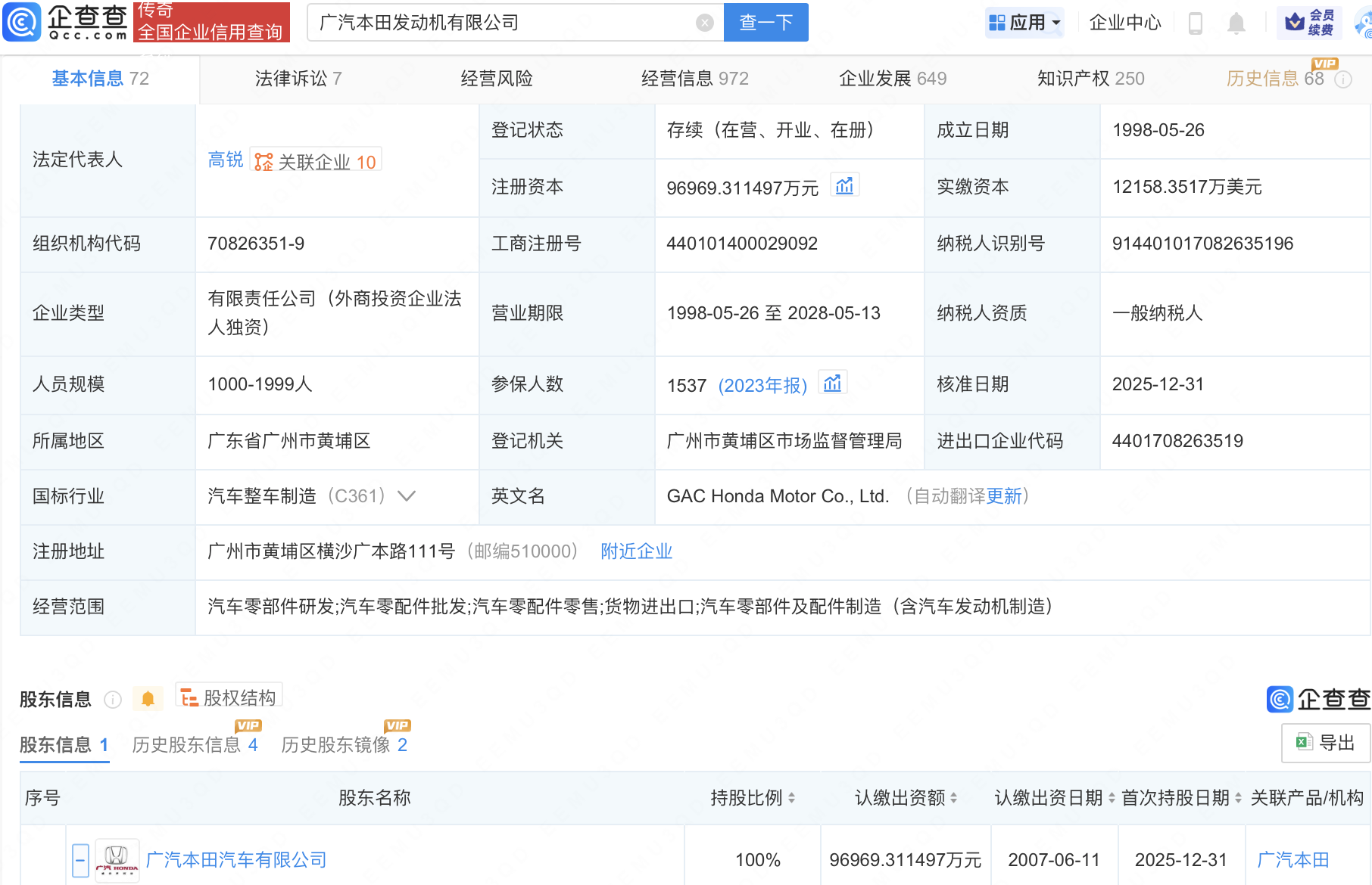 企查查APP显示,近日,原东风本田发动机有限公司发生工商变更,东风集团股份(00489.HK)等退出股东行列,新增广汽本田汽车有限公司为全资股东,同时企业名称变更为广汽本田发动机有限公司。企查查信息显示,该公司成立于1998年,经营范围包含:汽车零部件研发、汽车零配件批发、汽车零配件零售等。此前,广汽集团(601238)发布公告称,同意广汽本田收购东风集团股份持有的东本发动机50%股权。广汽本田完成股份收购后,东风集团股份将完全退出东本发动机公司,在完成交易后,东本发动机将成为广汽本田全资子公司,持有东本发动机100%的股份。
