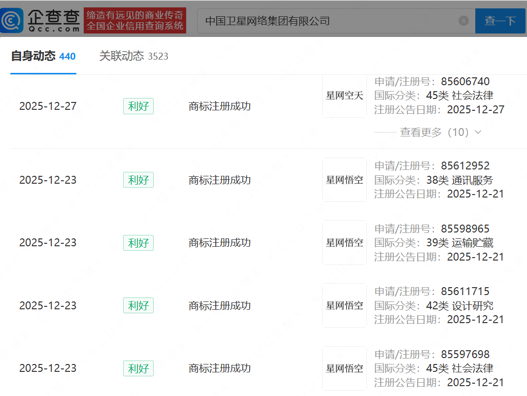 企查查APP显示,近日,中国卫星网络集团有限公司成功注册星网空天、星网经纬、星网纵横等星网系列商标,国际分类涉及社会法律、设计研究、通讯服务等。