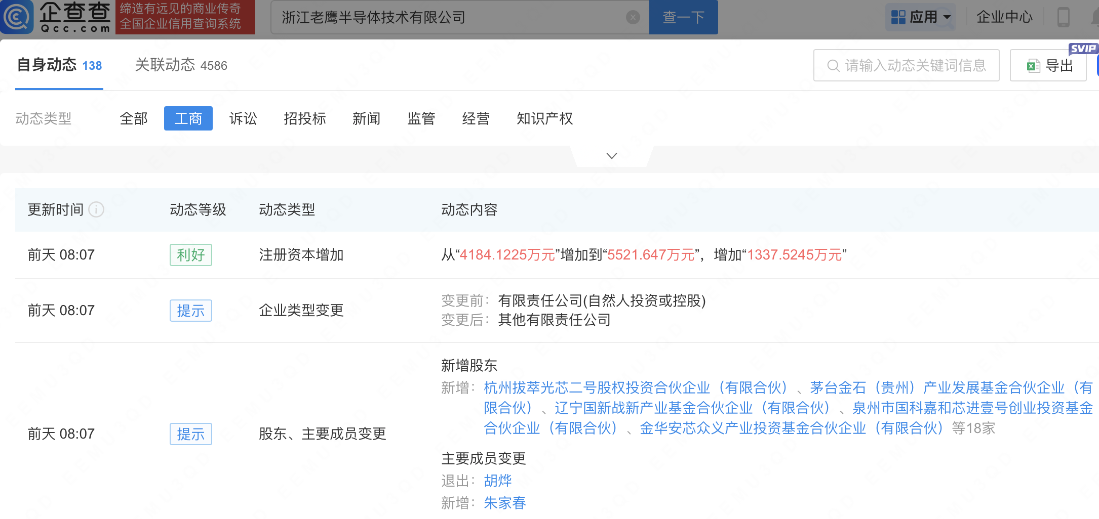 企查查APP显示,近日,浙江老鹰半导体技术有限公司发生工商变更,新增茅台金石(贵州)产业发展基金合伙企业(有限合伙)等为股东,同时注册资本增至5521.65万元。企查查信息显示,该公司成立于2018年,经营范围包含:半导体照明器件制造;集成电路芯片及产品制造;显示器件制造等。公开信息显示,老鹰半导体是一家光互连VCSEL芯片IDM企业,专注于为AI智算中心、车载雷达和高阶智能机器人提供创新的高速传输与智能感知核心芯片、器件与应用解决方案。