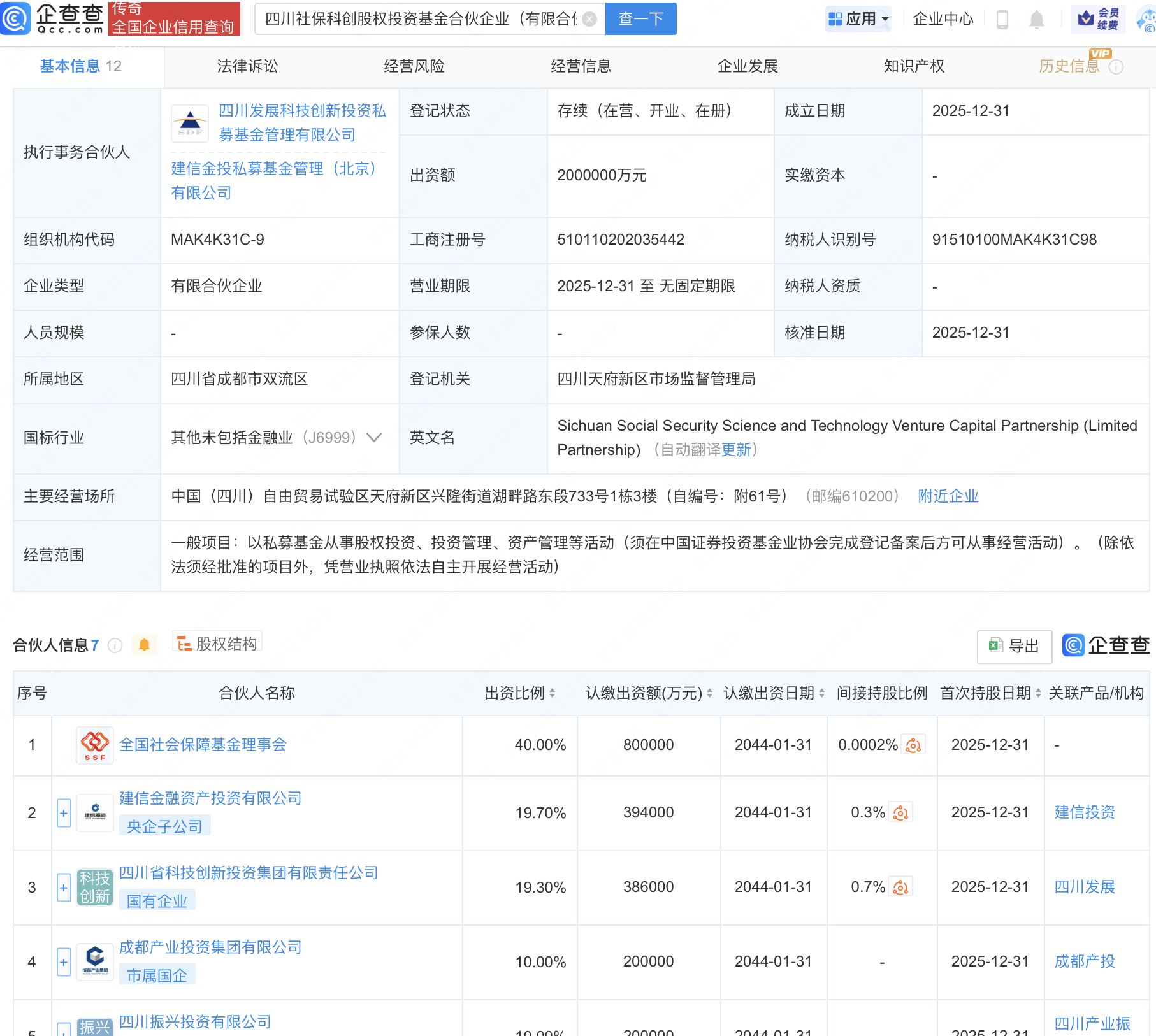 企查查APP显示,近日,四川社保科创股权投资基金合伙企业(有限合伙)成立,出资额200亿元,经营范围包含:以私募基金从事股权投资、投资管理、资产管理等活动。企查查股权穿透显示,该企业由全国社会保障基金理事会、建信金融资产投资有限公司等共同出资。